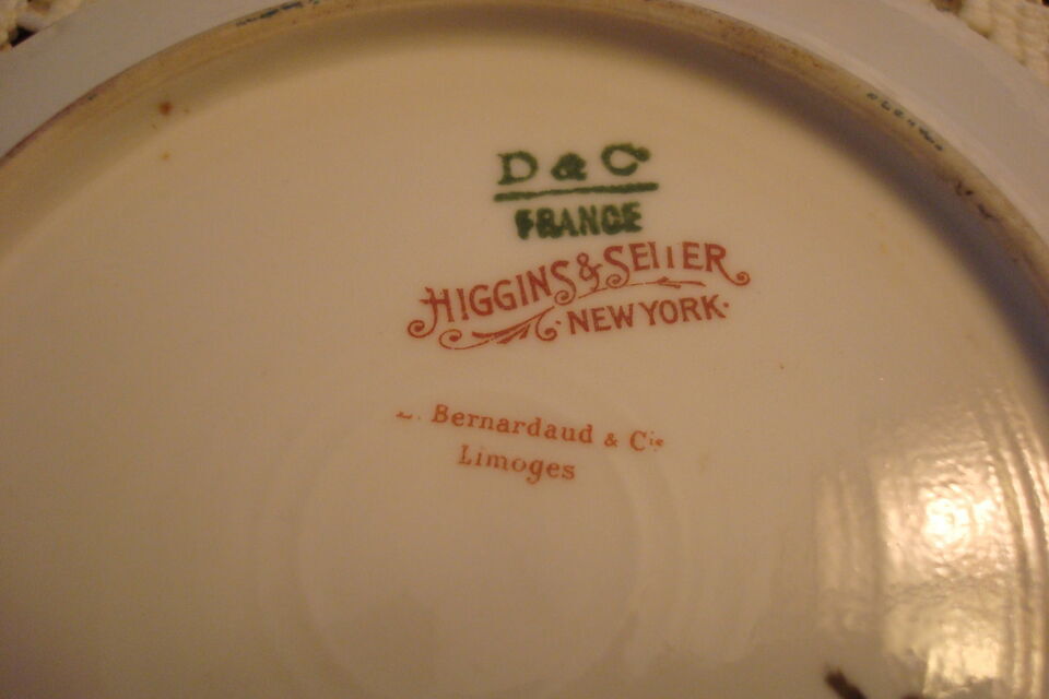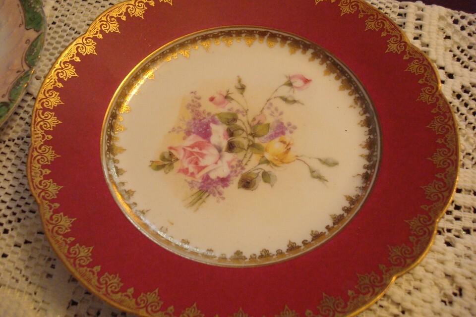 - D & C France Bernardeaud Higgins & Seller plate red gold and flowers, c1920s ORI