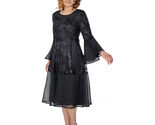 This elegant black A-line dress features shimmering sequin lace atop a mesh overlay for a sophisticated look. The design includes sheer bell sleeves and a matching sash belt that elegantly accentuates the waist, making it perfect for formal occasions and church events. The mid-length skirt and subtle floral detailing add graceful movement and timeless style.