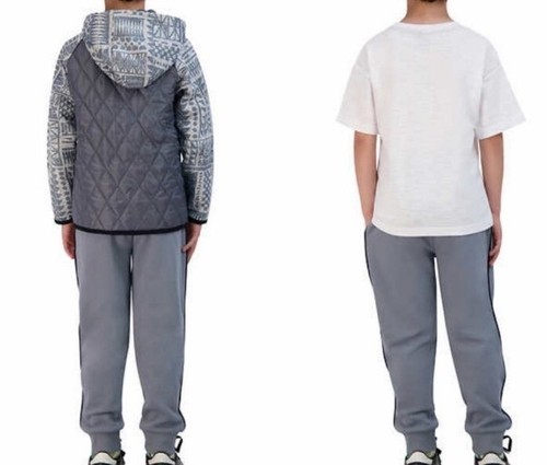 Jacket is a quilted pattern in gray with sweater sleeves hood in gray white