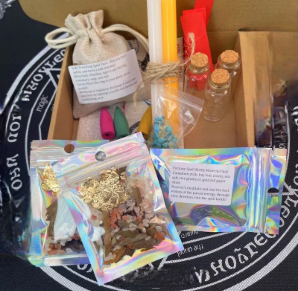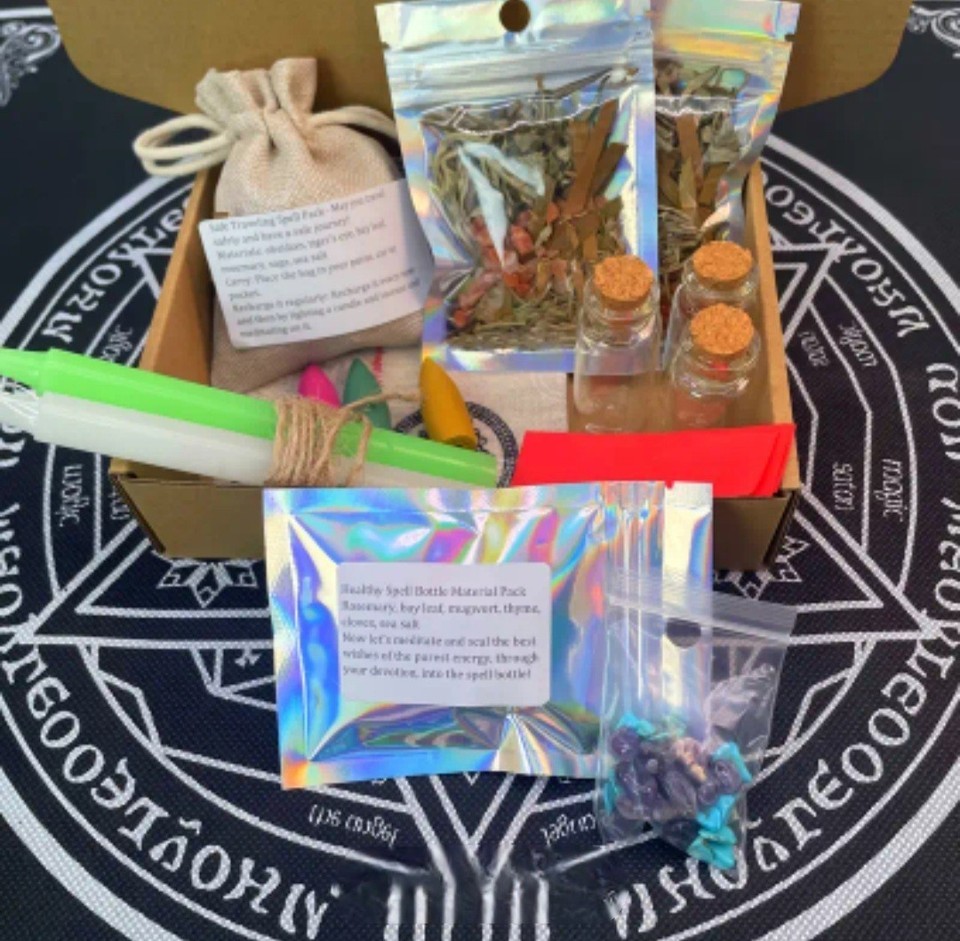 Tool kit includes: spell jar, scroll paper, herbal bag, incense, herbs, candle, gri gri bag.