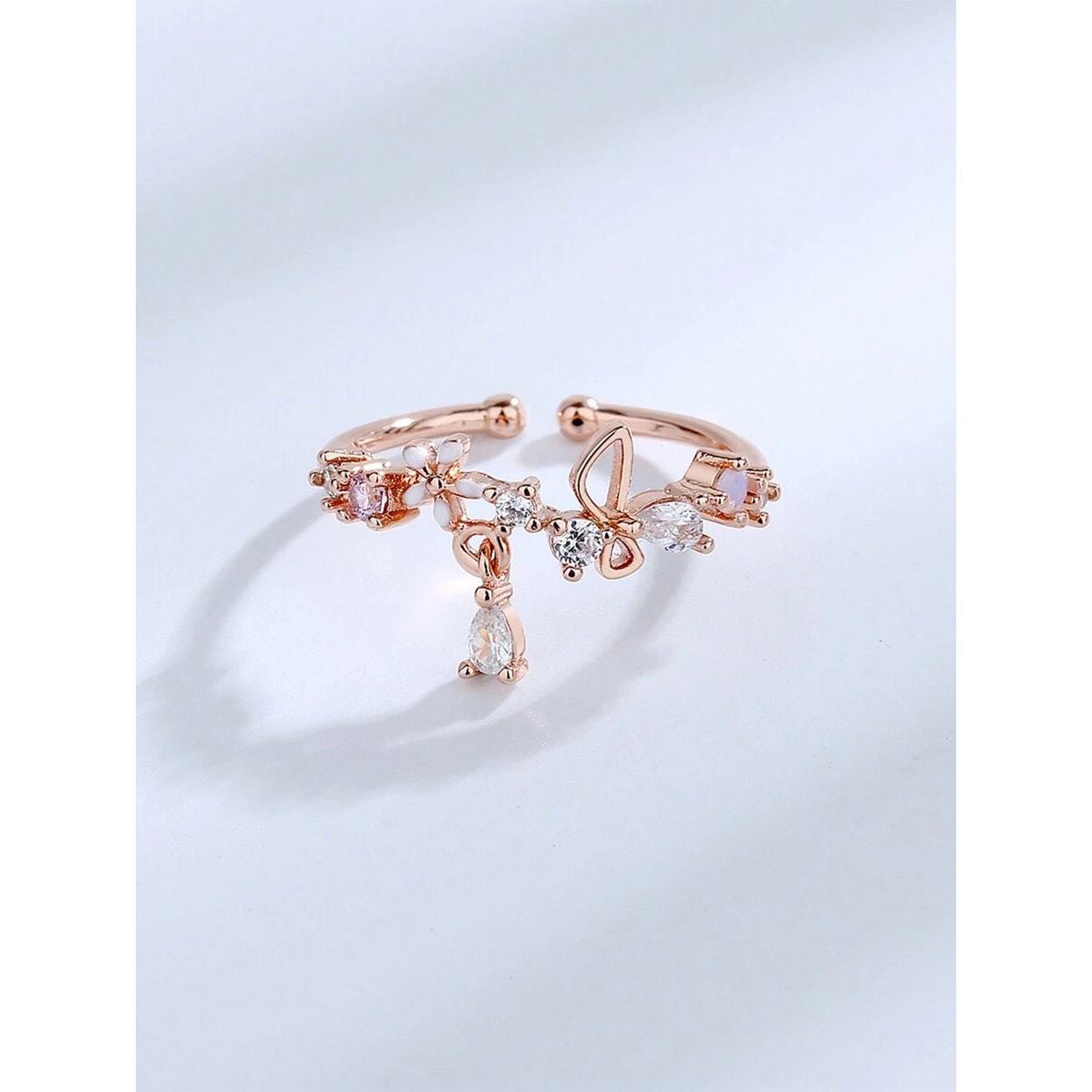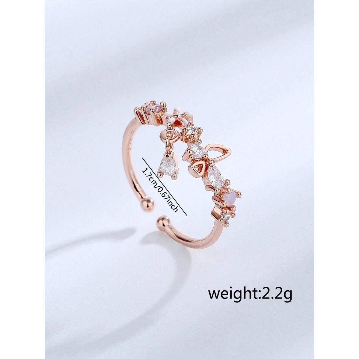 Add a touch of whimsical charm to your outfit with this Adjustable Butterfly Flower Ring. Crafted in a shimmering rose gold-tone alloy, this open band features delicate crystal accents, a dainty butterfly motif, mini flowers, and a drop-shaped charm for extra sparkle.