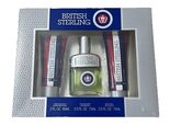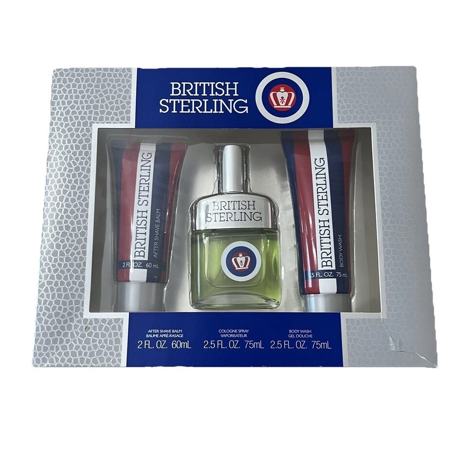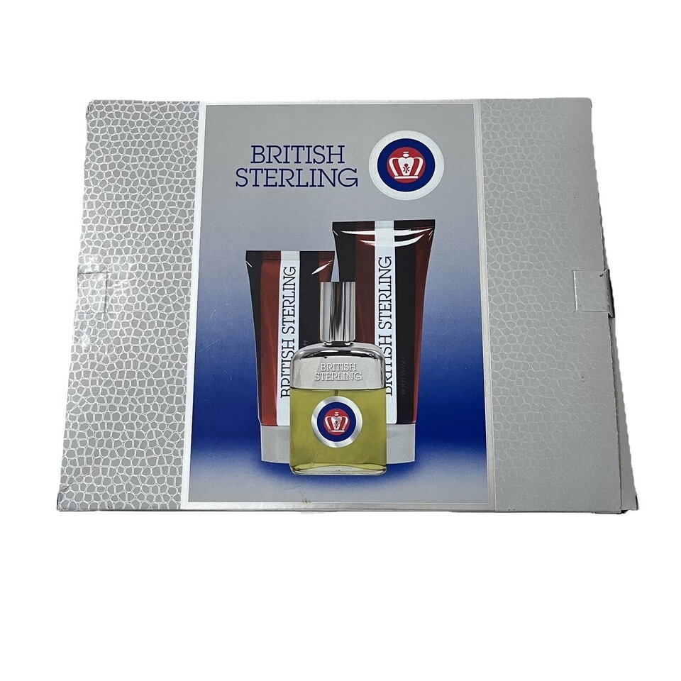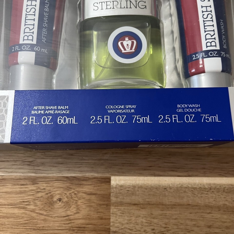 British Sterling Gift Set After Shave Balm Cologne Spray Body Wash. Package has light shelf wear but the products inside are new and unused.