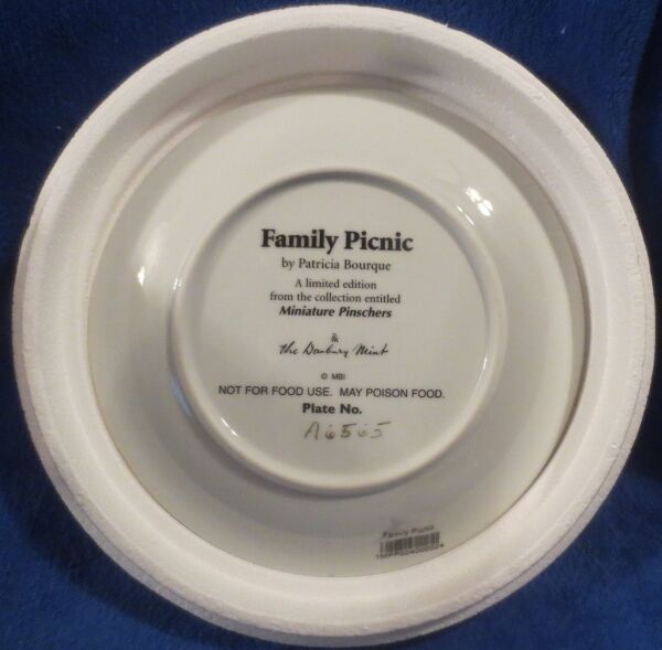 Danbury Mint Miniature Pinschers Collection Family Picnic by Patricia Bourque. Limited edition collector's plate not for food use.