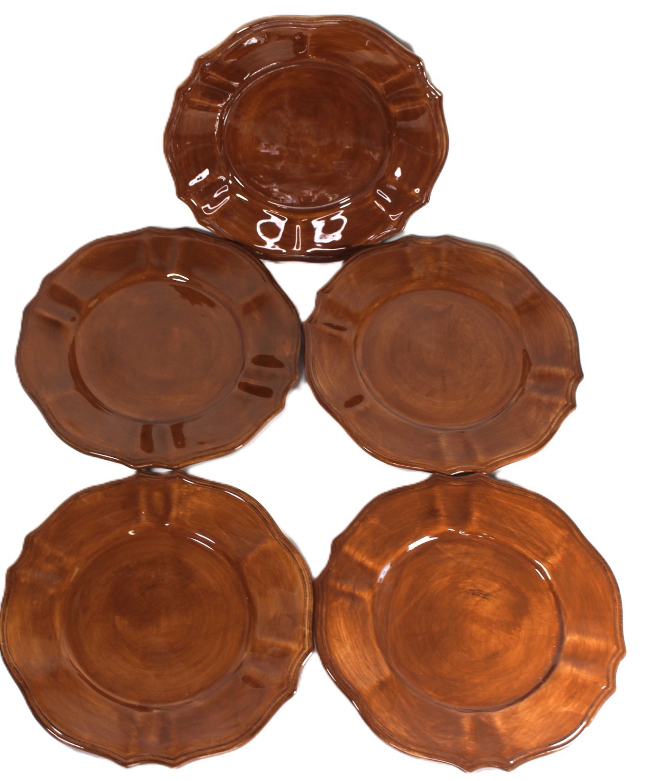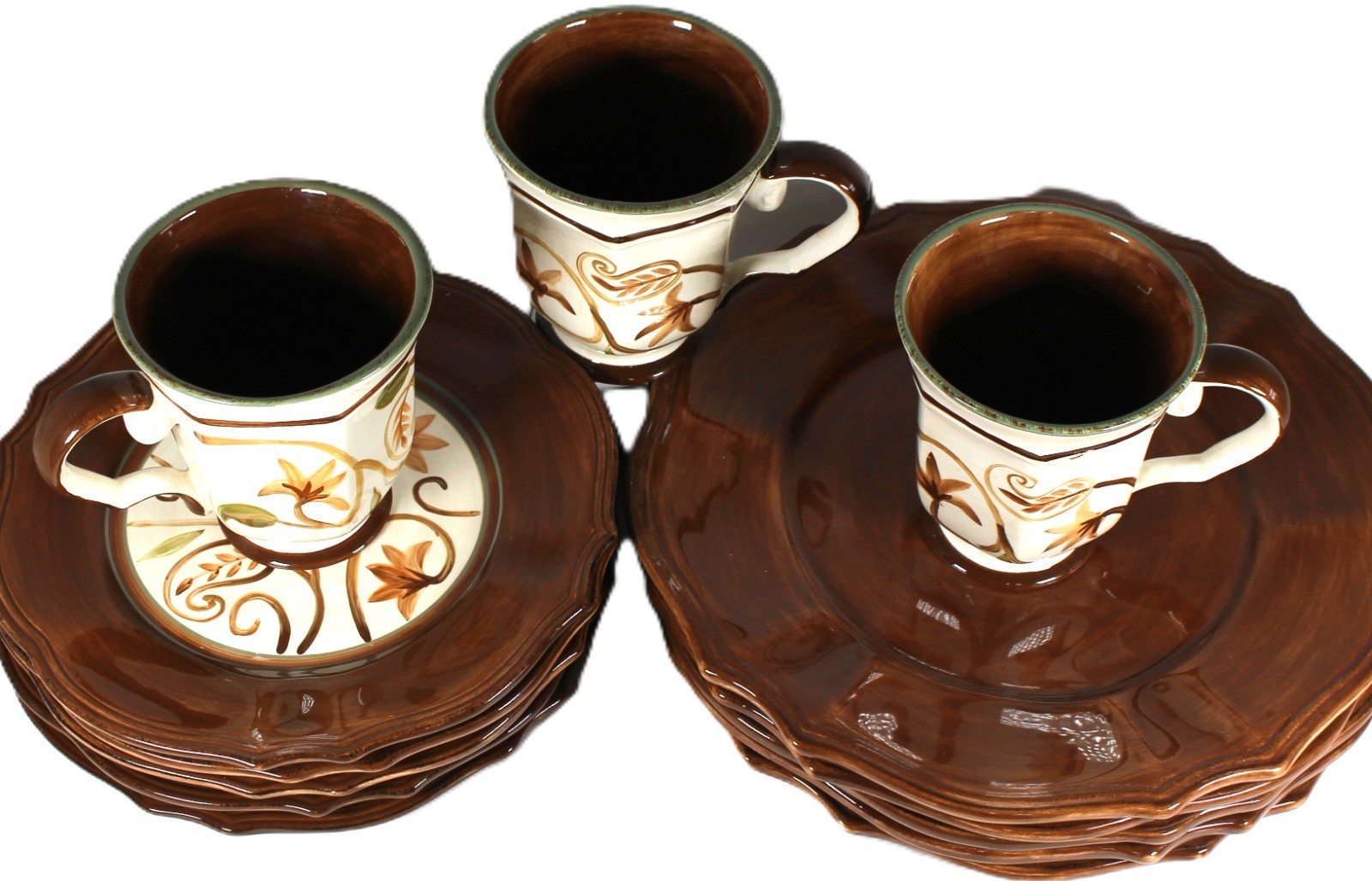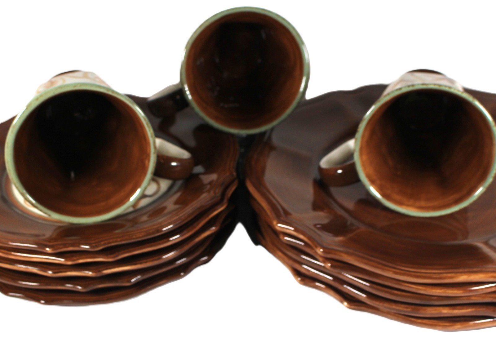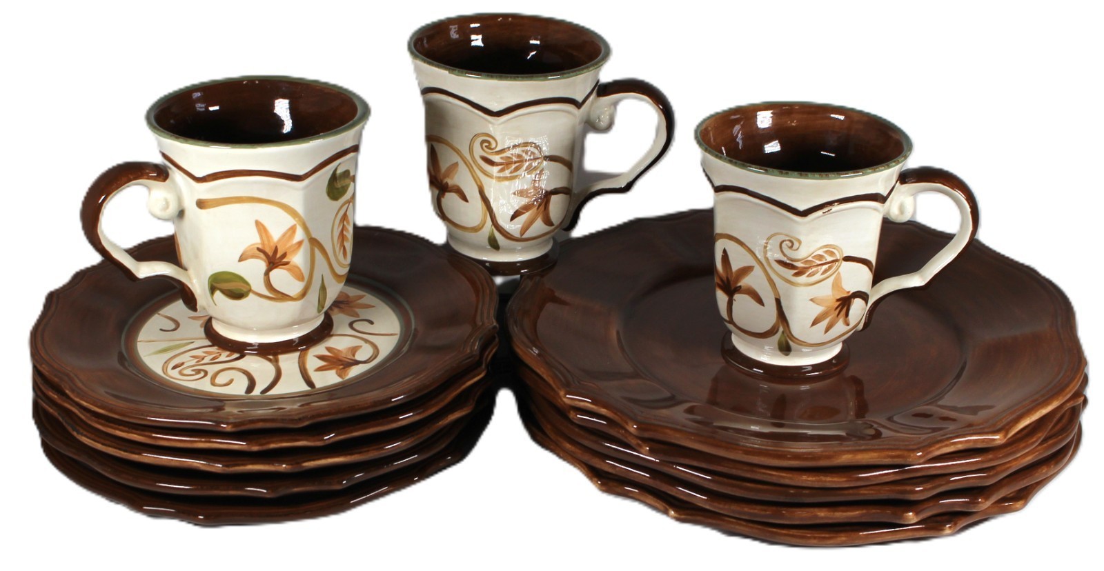 13 pc. set includes: Five 10 in. Rustic Brown Dinner Plates, 5 8 in" printed salad plates, and 3 Sixteen oz. Mugs.