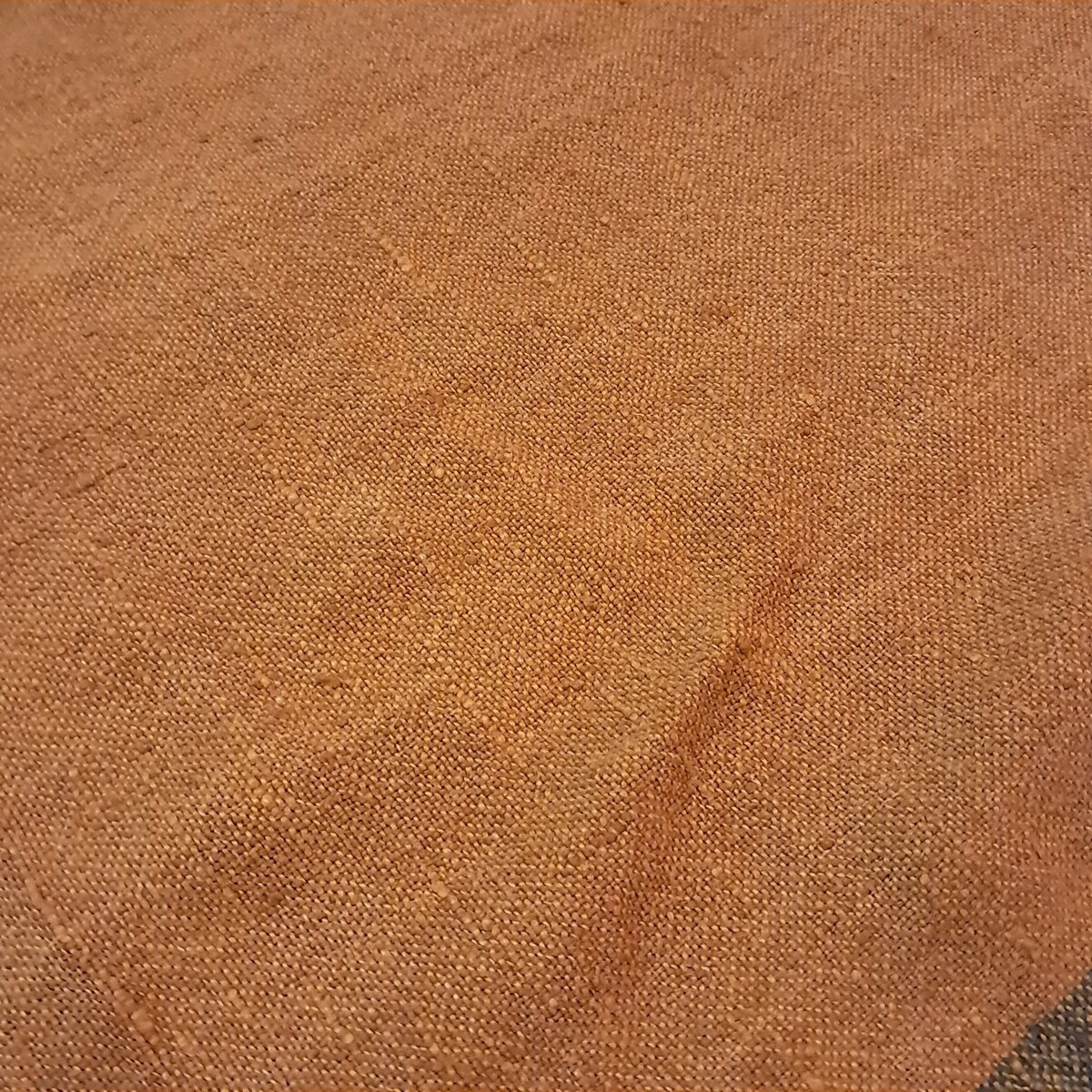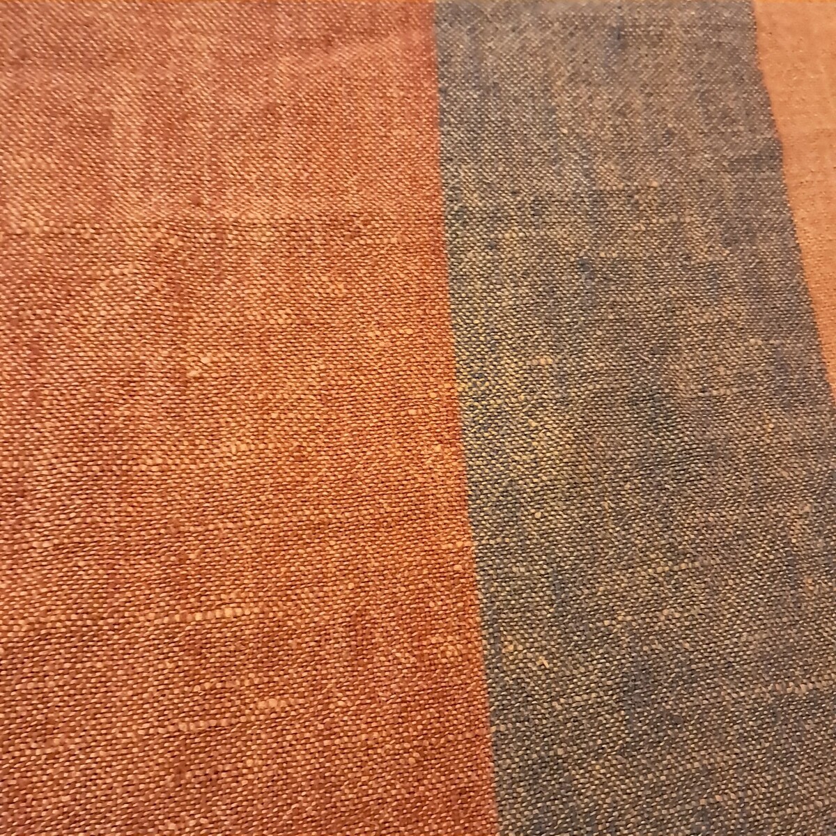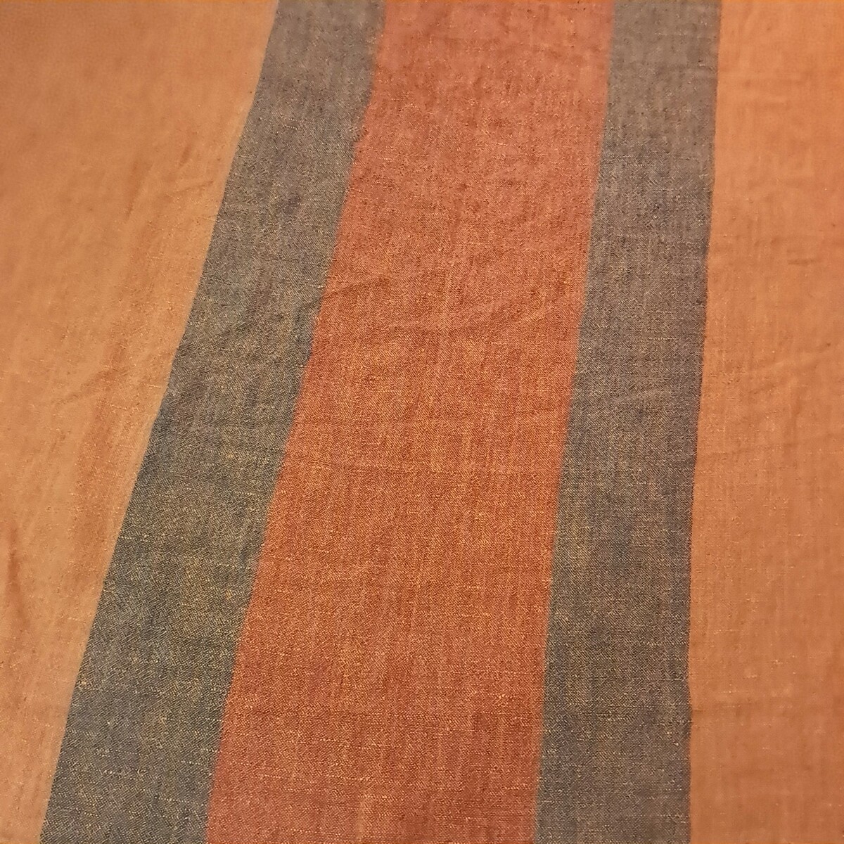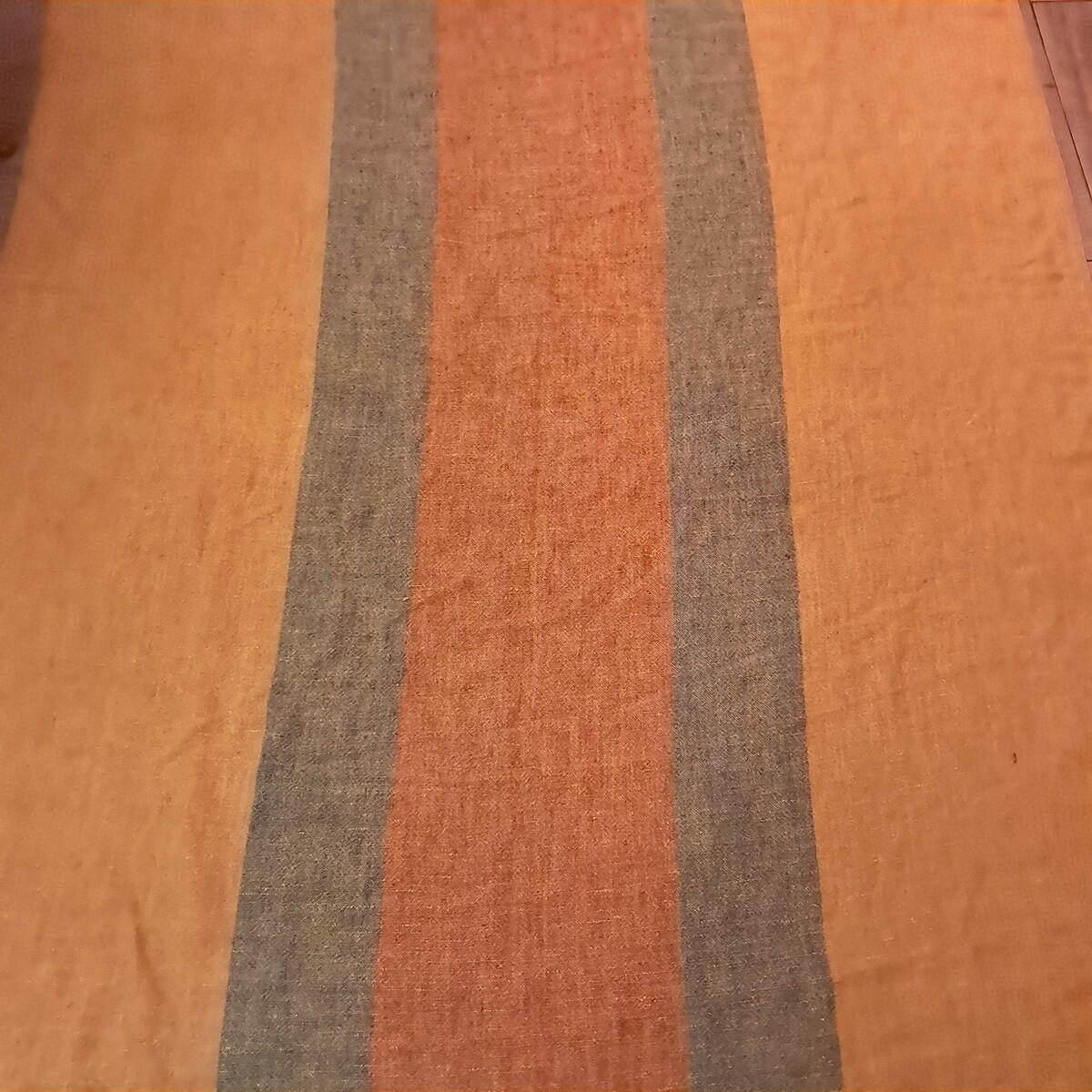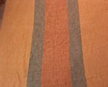 Approximately 56x80" Harvest gold with burnt orange and greenish/blueish stripe. Nubby linen fabric. Brand tag is missing. Very good to excellent condition.