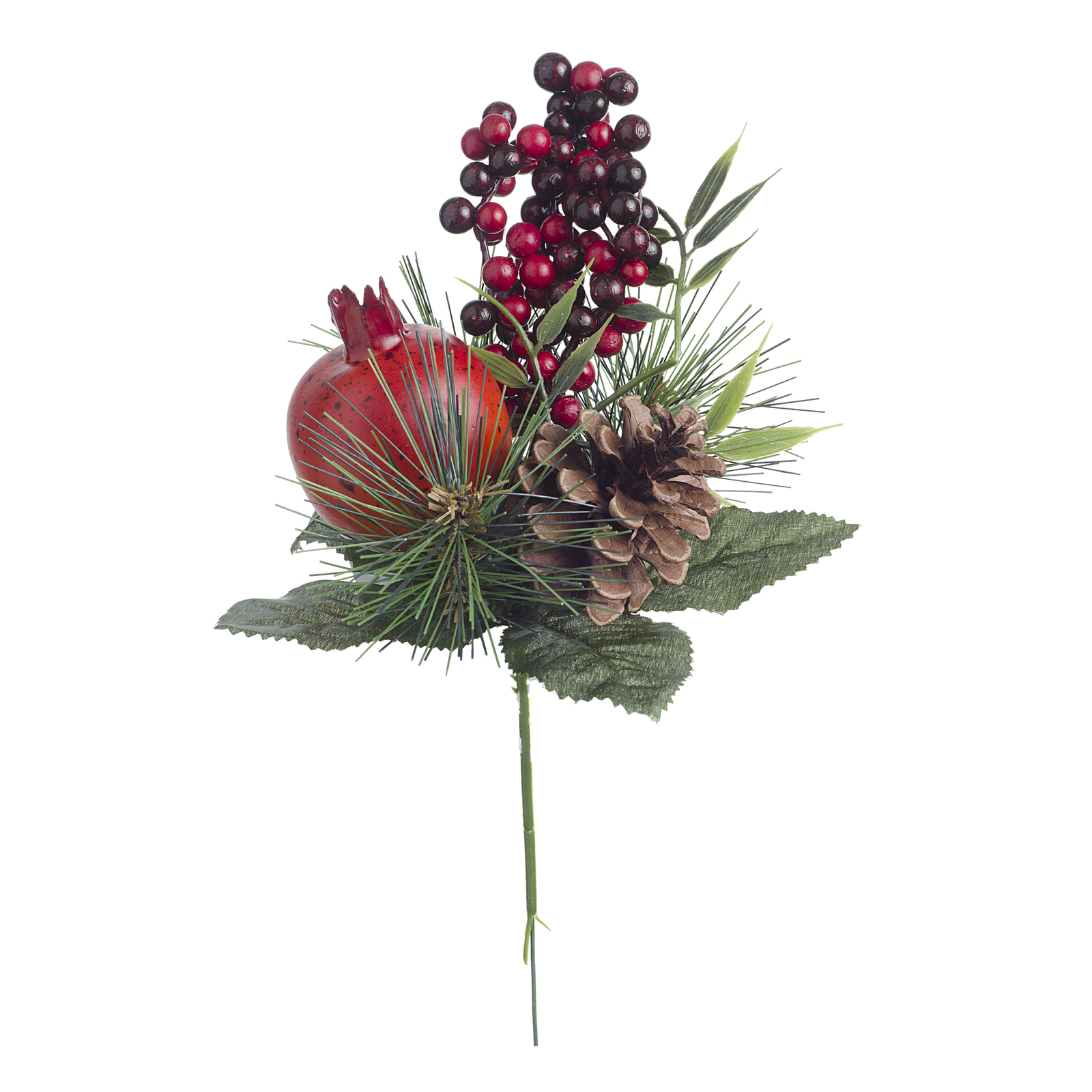 Darice Pomegranate and Pinecone Pick - Lend a hint of color to your winter arrangements with this pomegranate and pinecone pick. This 3 x 6.5-inch accent sports red, green, and brown hues and a variety of textures that help you give houseplants a quick seasonal makeover.