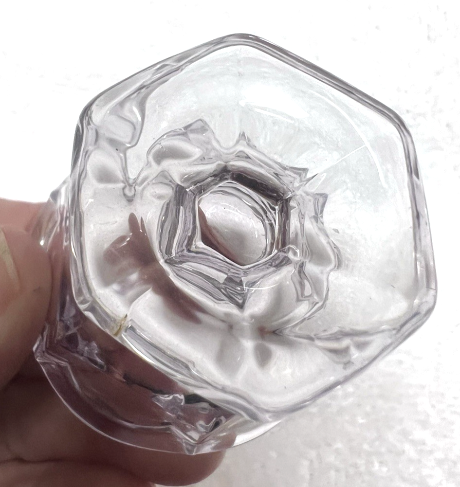 Darling Light Purple Glass Scalloped Rim Glass Open Salt Dip 1 7/8 x 1 3/4 inch. The glass is clear, but it has a purple hint to it (it is purple) also it has an odd circle in one panel, but it is how it was made also it doesn't stand out I just wanted to make sure you know