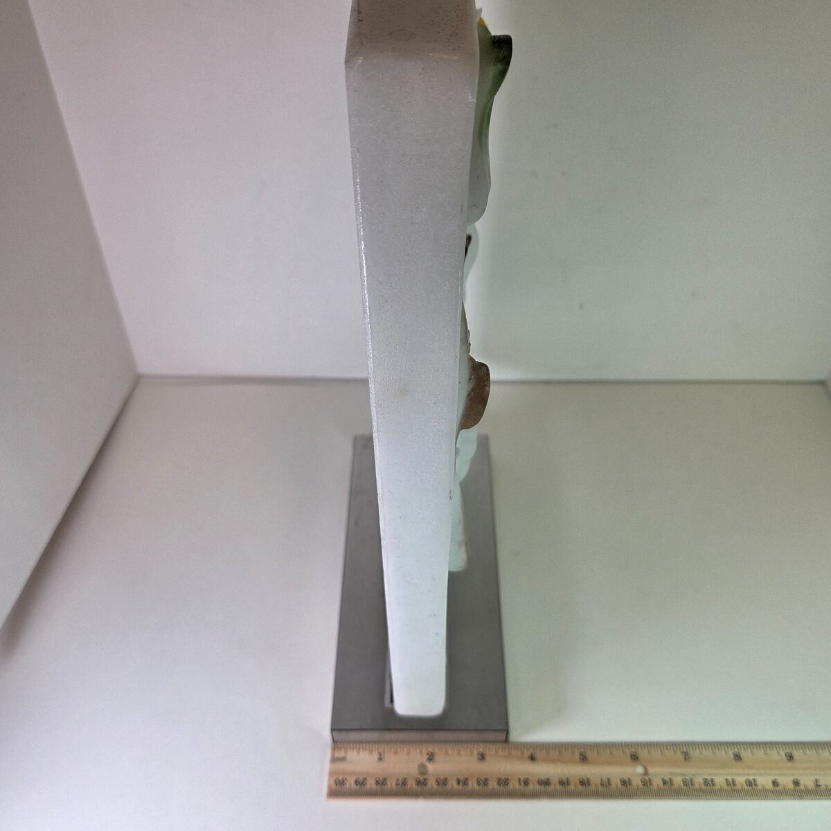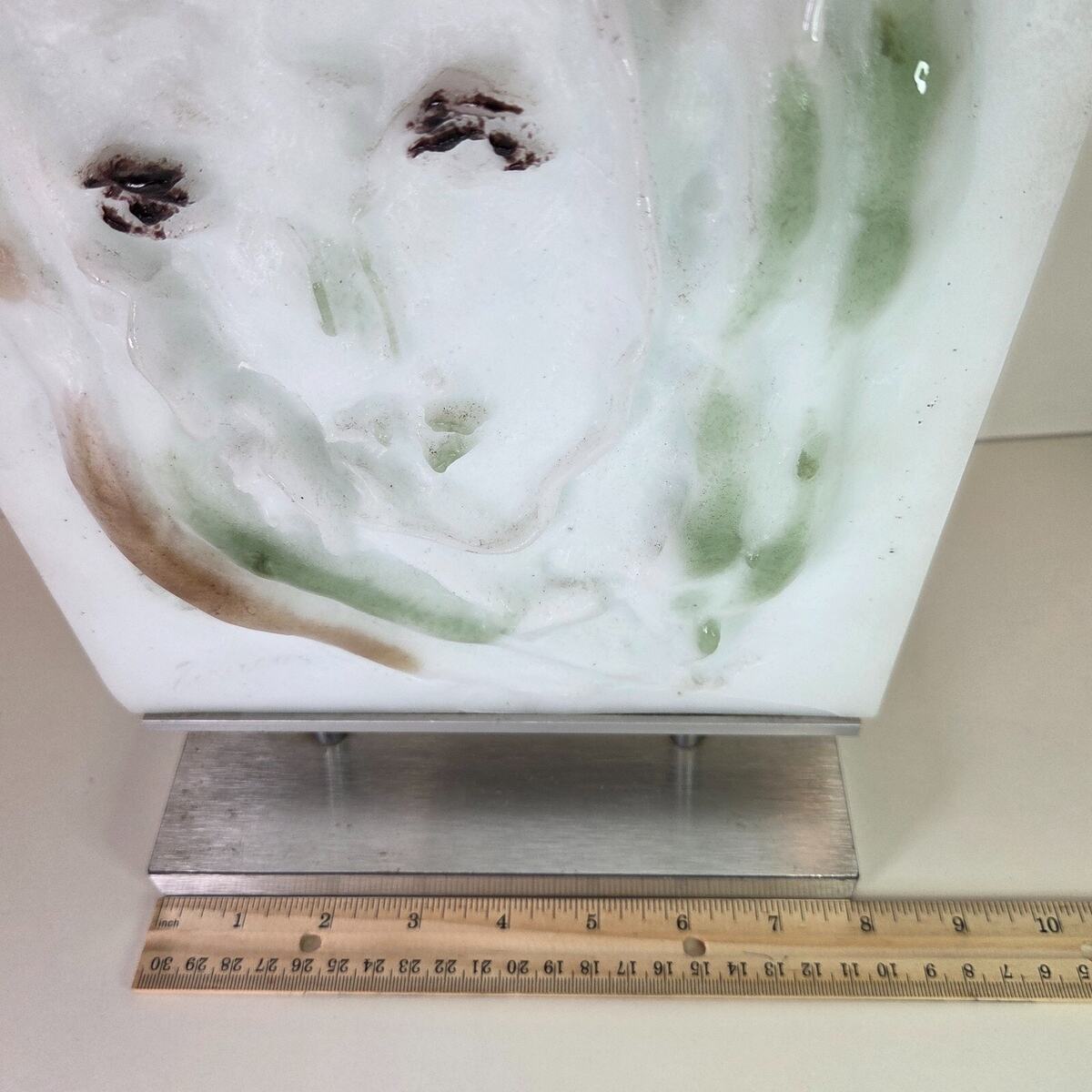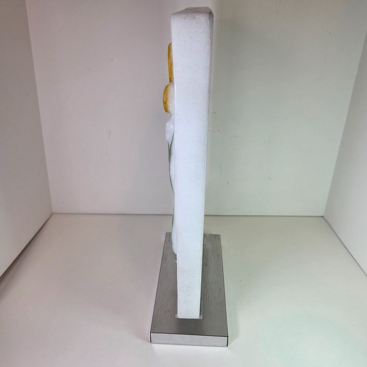Standing approximately 14" tall and 8.25" wide, the sculpture is mounted on a brushed aluminum stand and retains its original engraved artist plaque. Treccani's signature is visible on the lower edge, confirming its authenticity. The reverse is left natural, revealing the matte texture typical of kiln-cast glass. A stunning blend of form, technique, and artistry?ideal for collectors of Daum, Art Glass, or postwar European modernism.