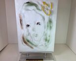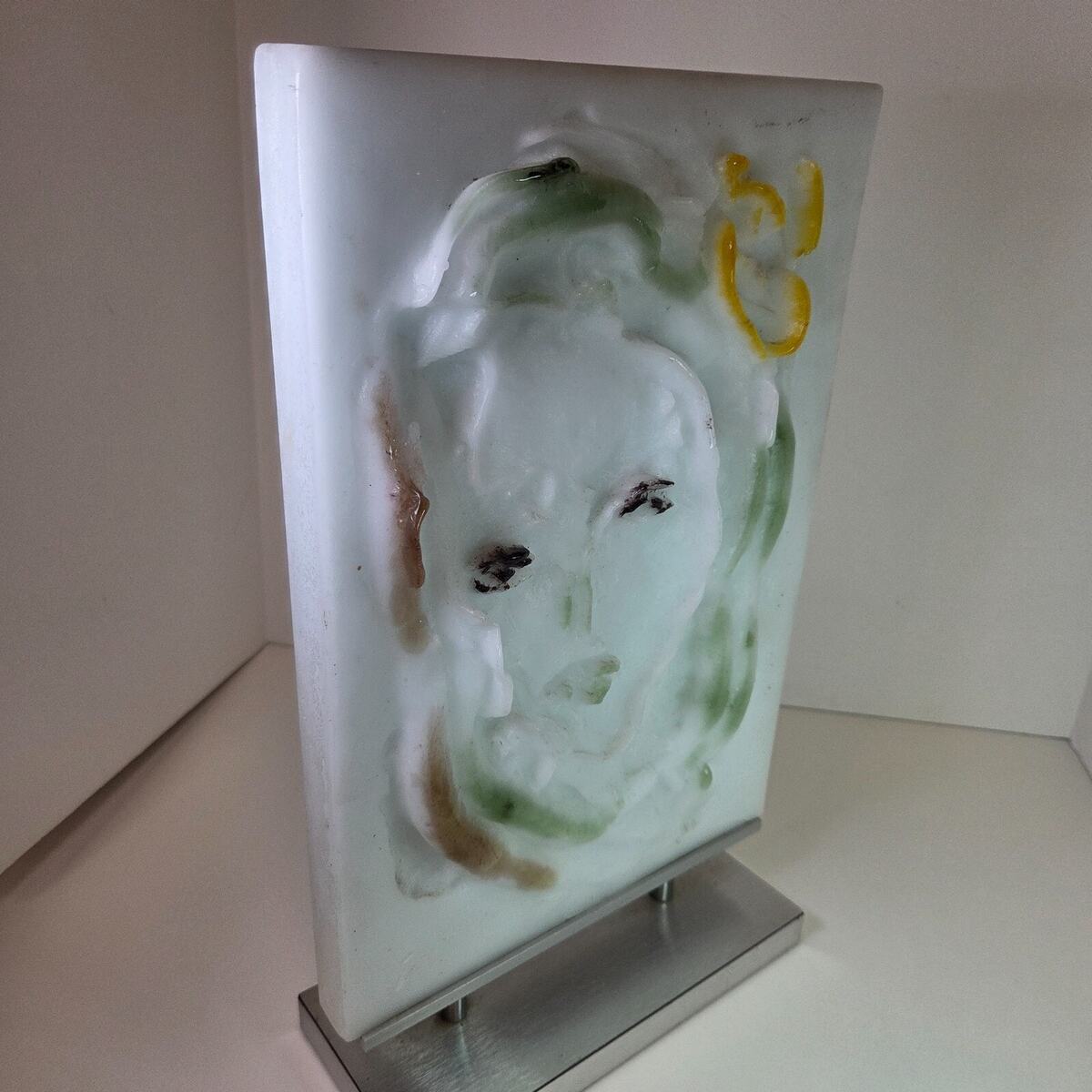 An exceptional example of modern French glass artistry, this Daum France "Piccolo Fiore" sculpture was created in collaboration with renowned Italian artist Ernesto Treccani. Crafted using the revered Pate de Verre technique, this piece features Treccani's delicate, ethereal portrait motif in soft green, amber, and white tones.