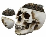 ? This spooky skull features a discreet compartment to store your stash, jewelry, candies or what have you! Hand painted in bonelike color, the base skull sculpture is made to replicate a human's cranium. The lid part which covers the top part of the skull comes in several options as seen in the photos.