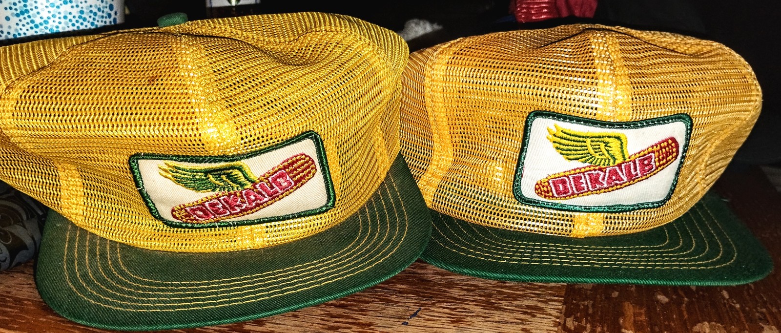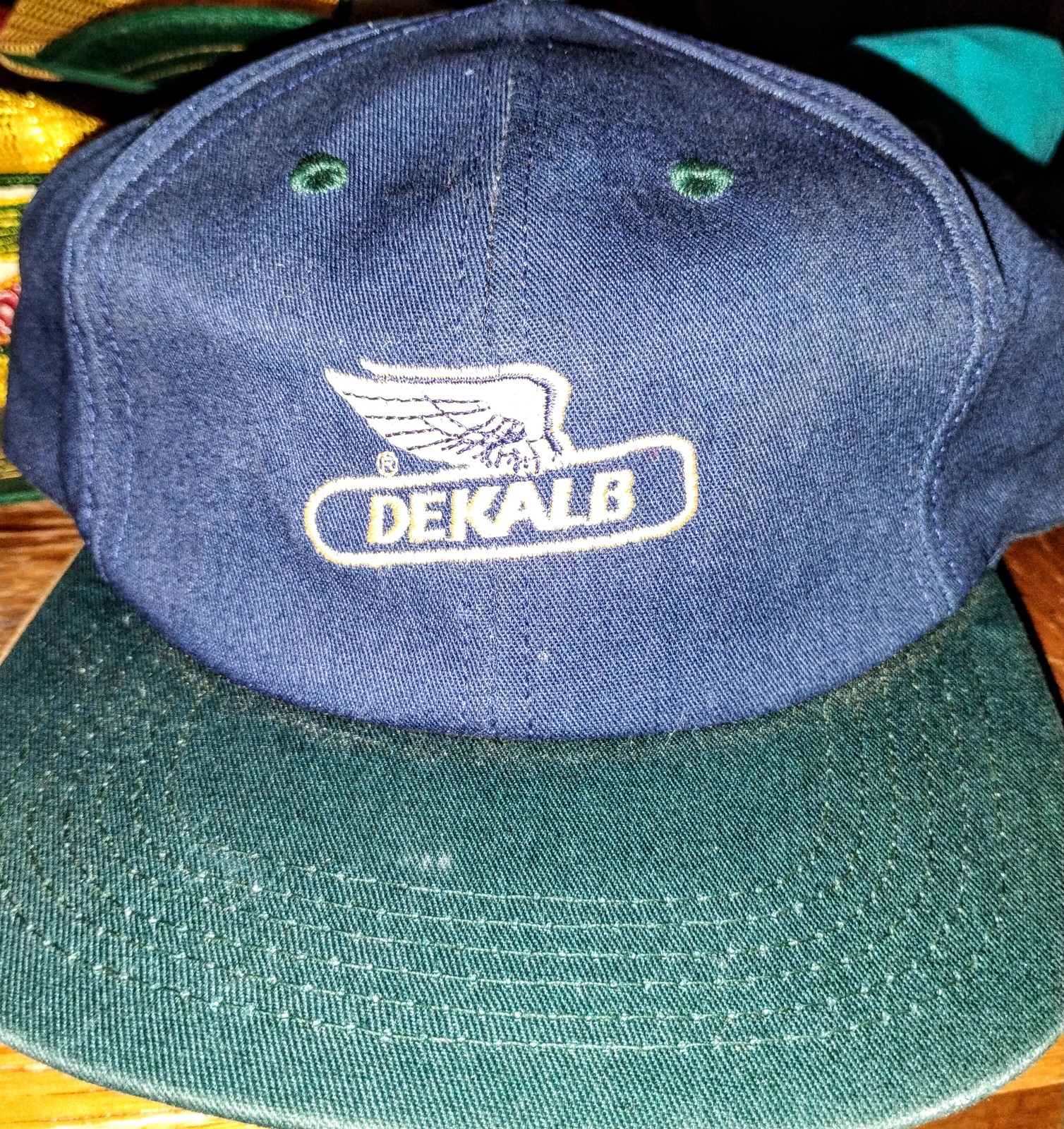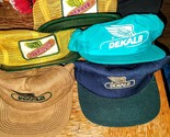 Lot of 5 vintage trucker style hats of variety material for DeKalb brand. 2 are identical.