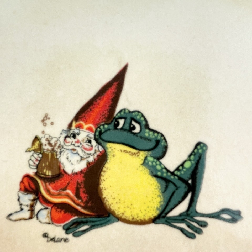 - DeLane Lange Gnome Art Tile Decorative Gnome Holding Stein Sitting w Frog