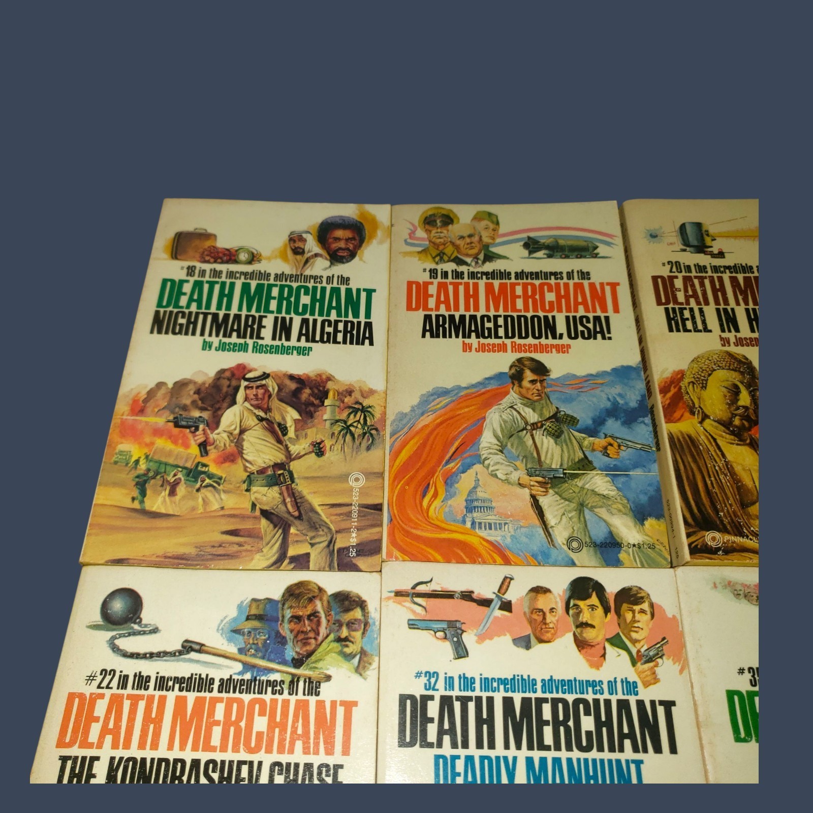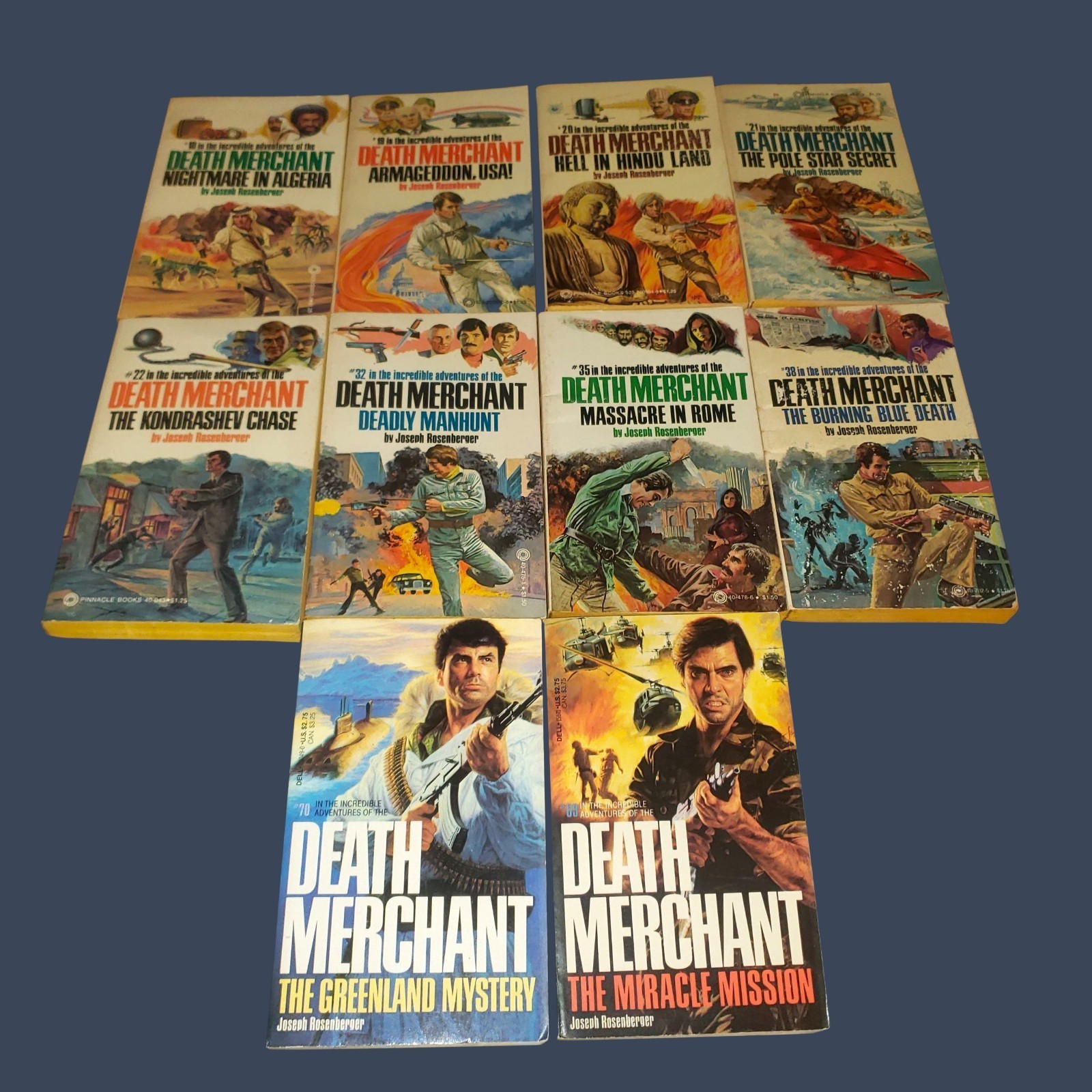 This lot of 10 vintage paperback novels by Joseph Rosenberger, published by Pinnacle Books between 1976-1988, is a collector's item for fans of action and adventure genres. The books in the series, titled "Death Merchant," offer thrilling adventures set in the 1970s era. With English language text, these novels are a nostalgic piece of literary history that will transport readers to a world of espionage and intrigue.