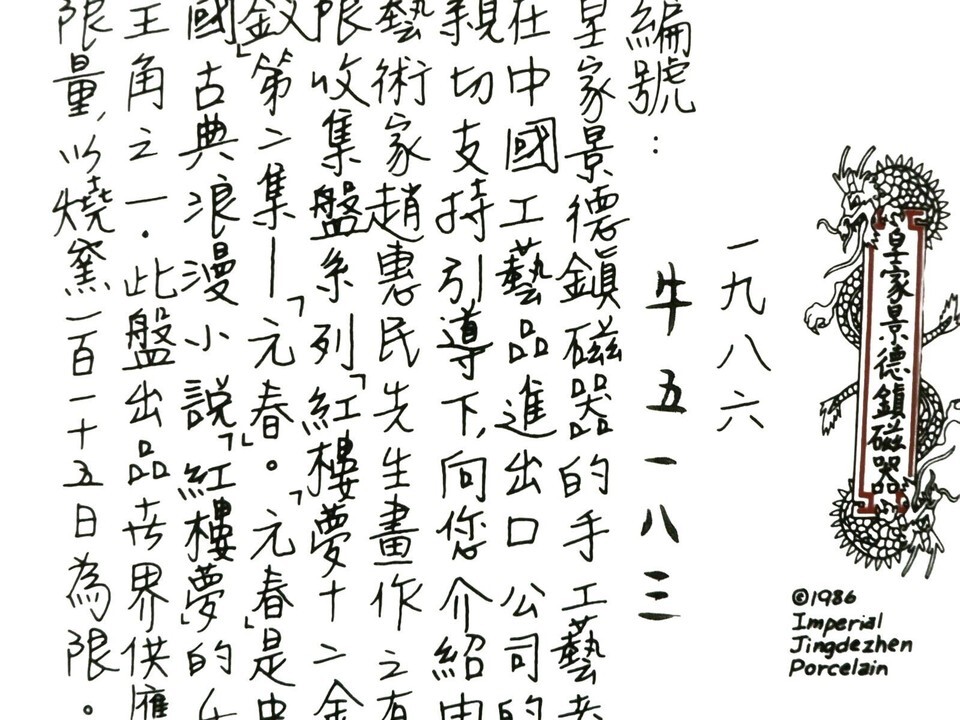 ? This plate is from the series titled "Beauties of Red Mansion" and is based on the classic Chinese novel, A Dream of Red Mansions by Hung Lou Meng in the 1700's.