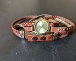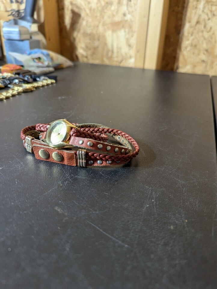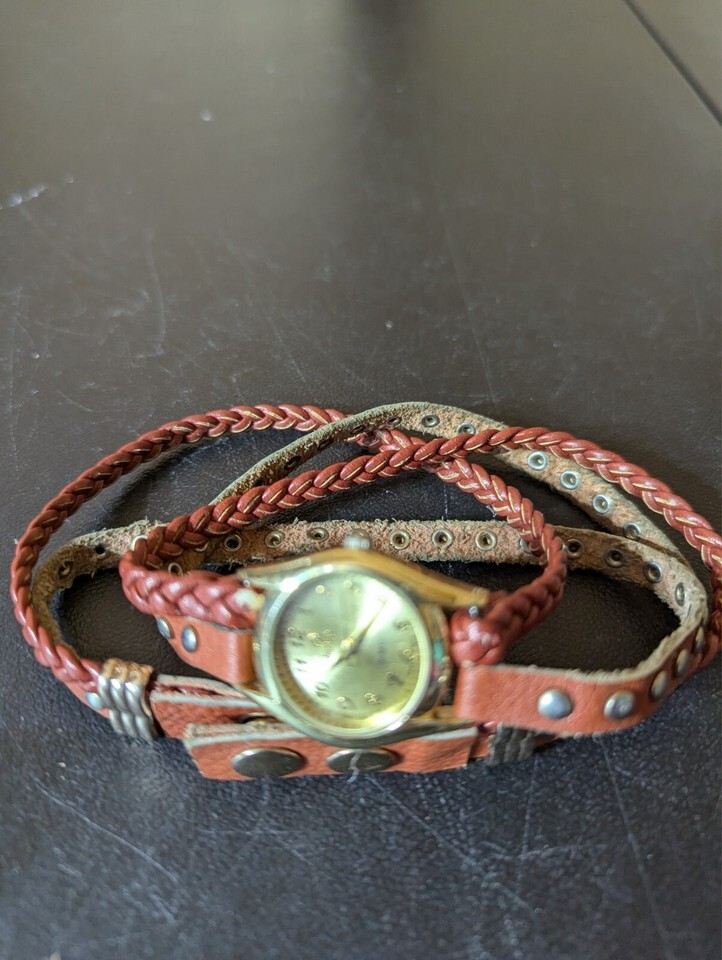 This is a vintage Decree analog wristwatch for women with a gold bezel and brown faux leather two-piece strap. It features a quartz movement, round stainless steel case, and gold dial with a seconds hand and 12-hour dial. The watch has a snap closure and includes service records. It has a casual style and includes features like an acrylic crystal and push/pull crown. It does not come with a seller warranty, papers, original box/packaging, or manual/booklet.