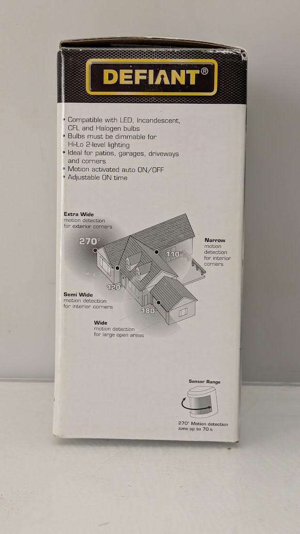 Contractor motion sensor light controller with 3 PIR sensors and 270 of coverage. Specifically designed to work with most types of bulbs, including LED, incandescent, CFL and halogen. Hi-Lo feature provides accent lighting at 30% brightness from dusk-to-dawn or dusk until the middle of the night with timer. (NOTE: Dimmable bulbs are required for the Hi-Lo accent/security feature) Lights go up to 100% brightness when motion is detected. Extension arm allows sensor to extend below PAR 38 bulbs and still provides 270 coverage or can be retracted for more compact look. Automatic sensitivity adjustment optimizes the sensitivity of the unit using the built-in integrated circuit. Dusk time allows you to set custom dusk level. TEST mode for easy set-up. ECO setting minimizes energy usage. Eave and wall mountable. Operates multiple lights on the same circuit, up to 100-Watt LED or 300-Watt incandescent or halogen lighting.