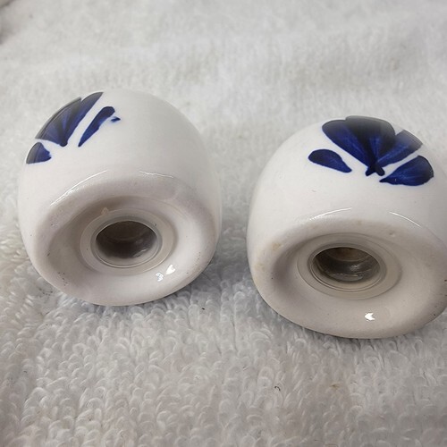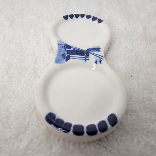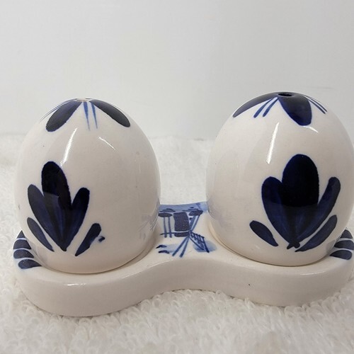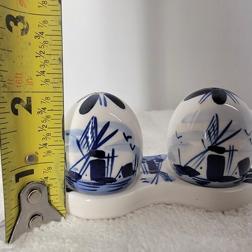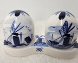 - Delft Blue Hand Painted Egg Salt & Pepper Shakers Set w/Underplate VTG Windmills