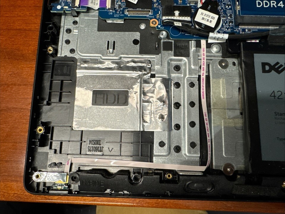 Missing hard drive, hard drive caddy, ribbon cable for hard drive.