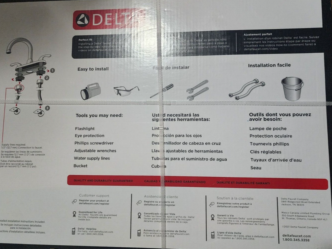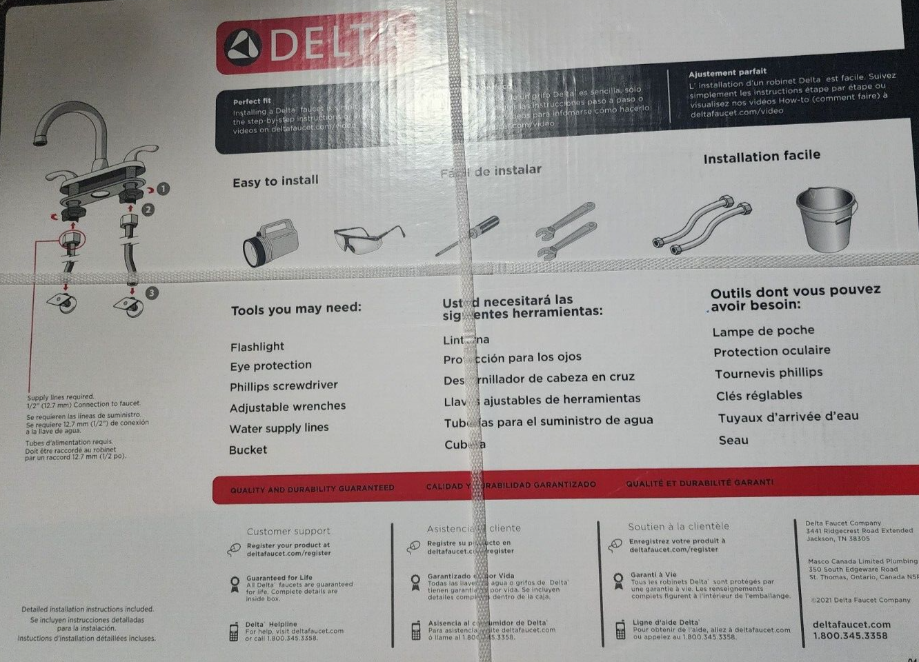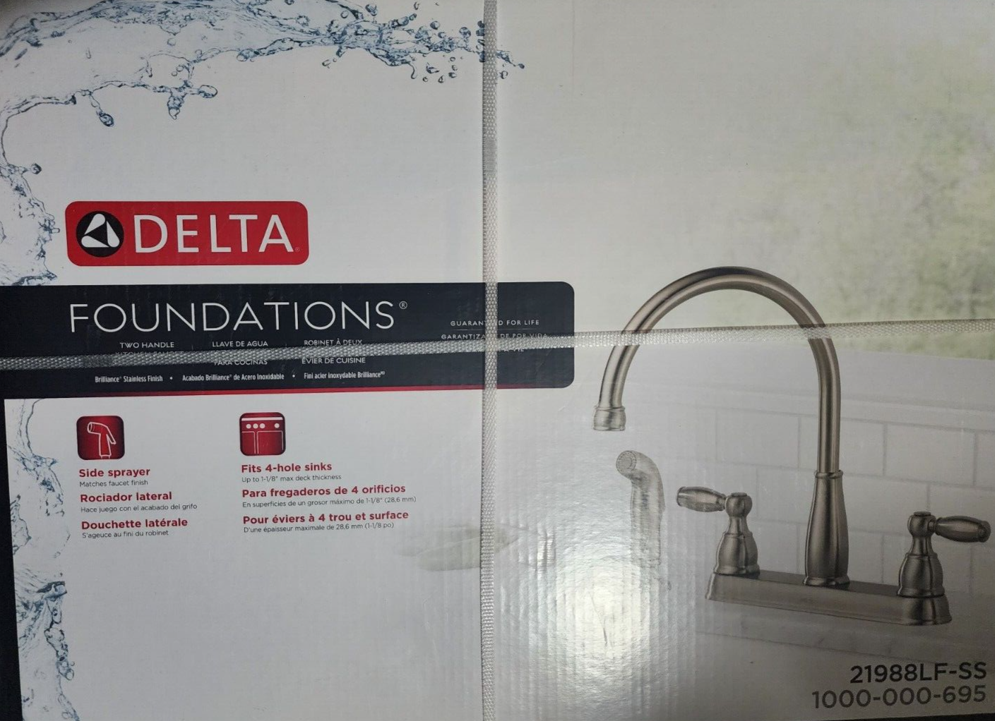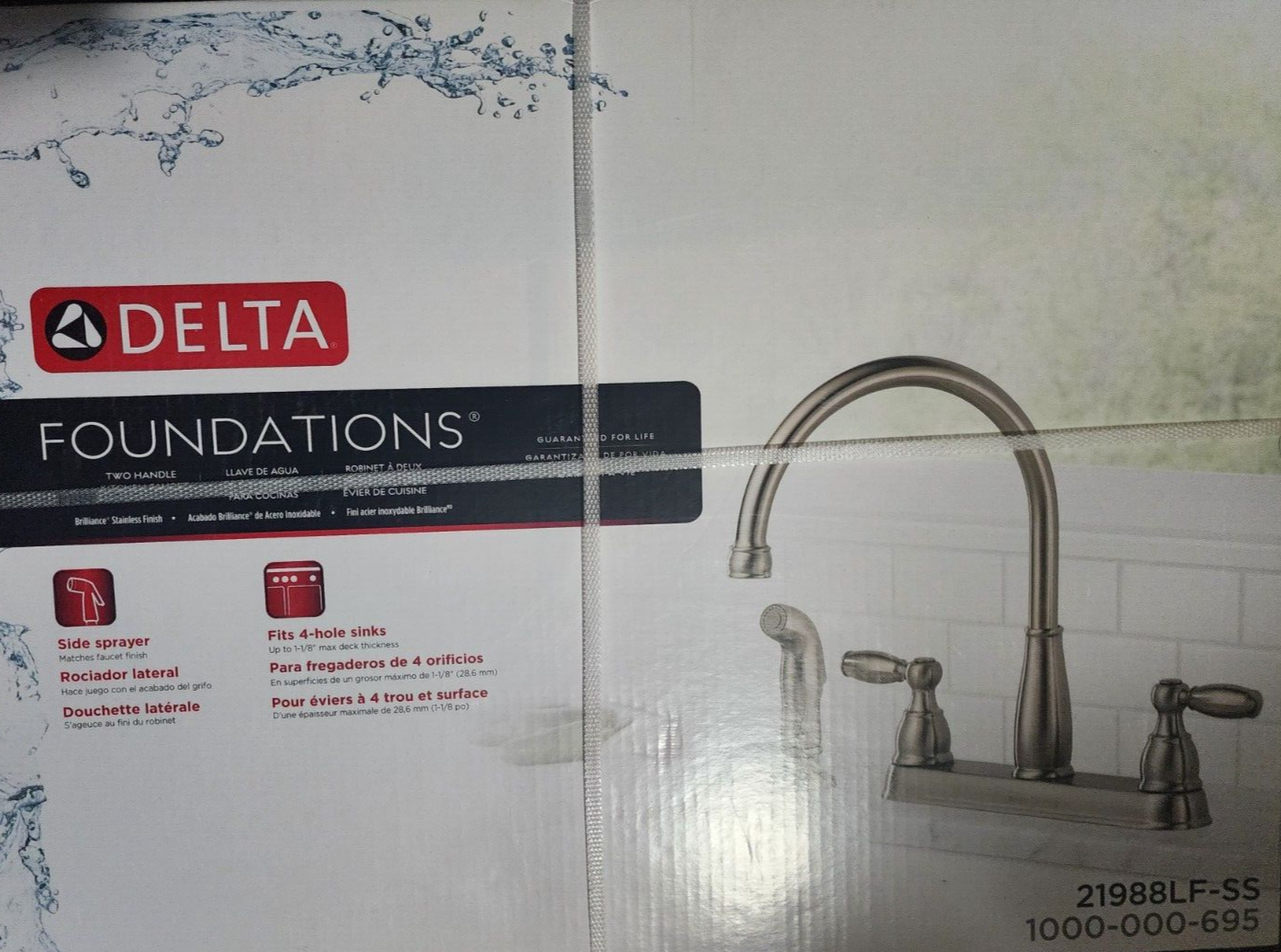 You are Buying a Brand New And Factory Sealed Delta Foundations 2-Handle Standard Kitchen Faucet with Side Sprayer in Stainless Model # 21988LF-SS.... Delta Foundations 2-Handle Side Spray Kitchen Faucet in Stainless offers beauty and function. It has a 2-handle design for precise adjustment of hot and cold water. It's ADA-compliant and easy for every family member and guest to use.