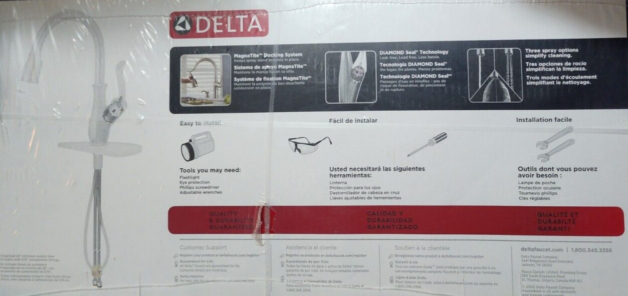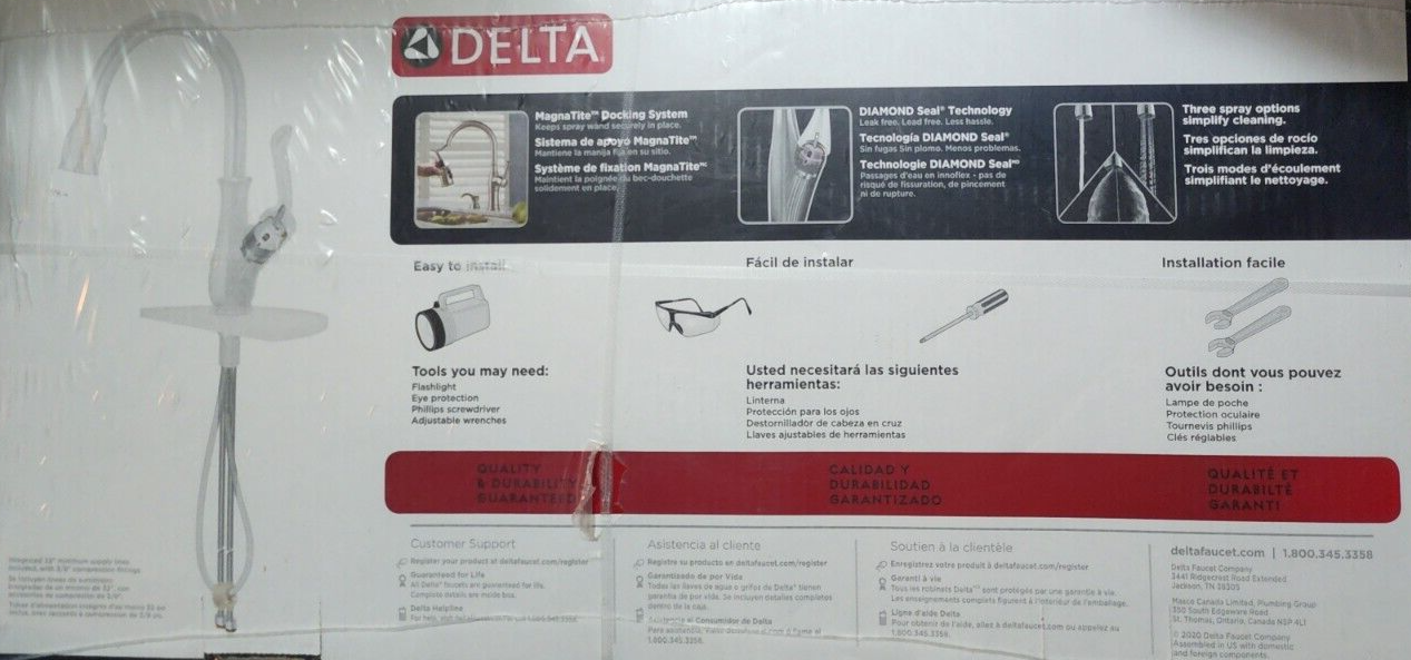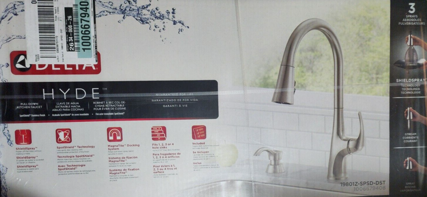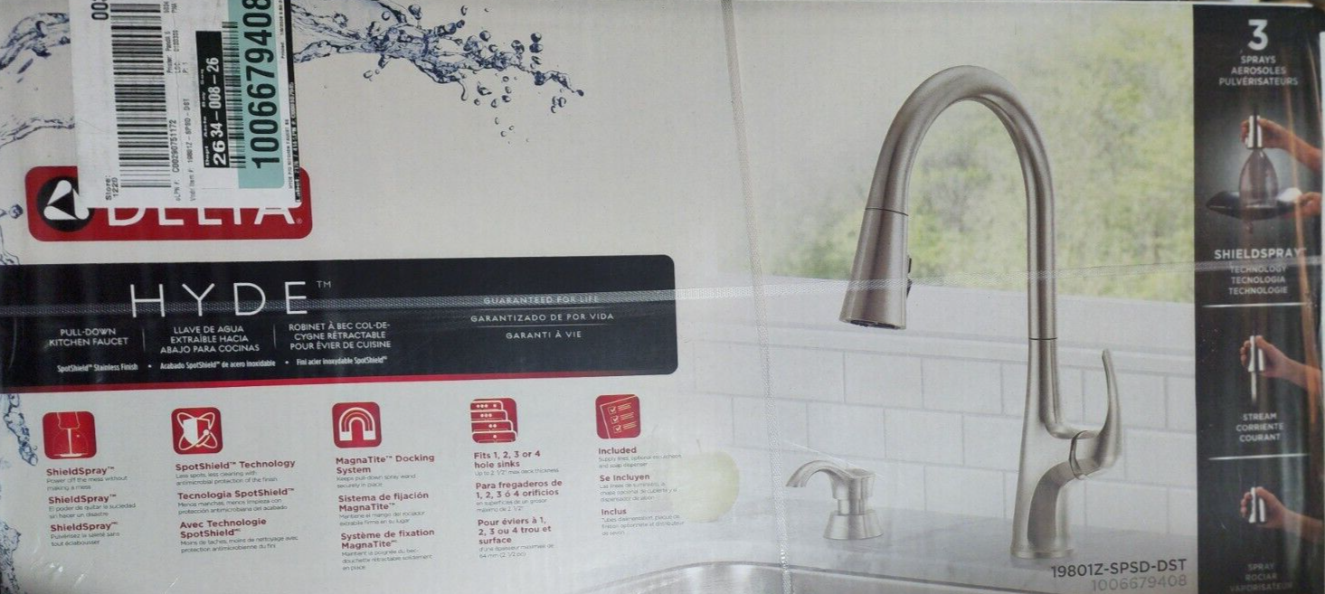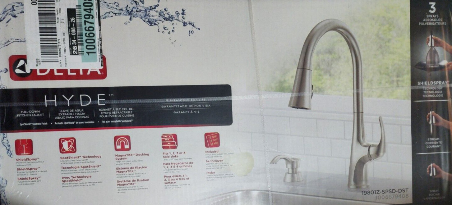 You are Buying a Brand New And Factory Sealed Delta Hyde Single-Handle Pull Down Sprayer Kitchen Faucet with ShieldSpray Technology in Spotshield Stainless Model # 19801Z-SPSD-DST..... Delta kitchen faucets are backed by our Lifetime Limited Warranty.