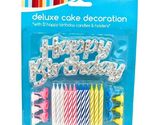 Make your birthday cake stand out with this Deluxe Cake Decoration Kit featuring a dazzling silver "Happy Birthday" topper along with 12 colorful striped candles in pink white blue and yellow. This set comes complete with matching candle holders ensuring secure and stylish candle placement for that perfect birthday wish moment. The sparkling topper adds an eye-catching festive flair to your cake making any celebration more memorable. Packaged in a clear easy-to-view plastic casing with a vibrant backing this kit offers convenience for storage and quick access when you are ready to decorate. Perfect for all ages this kit is a must-have for creating a fun and festive cake display.