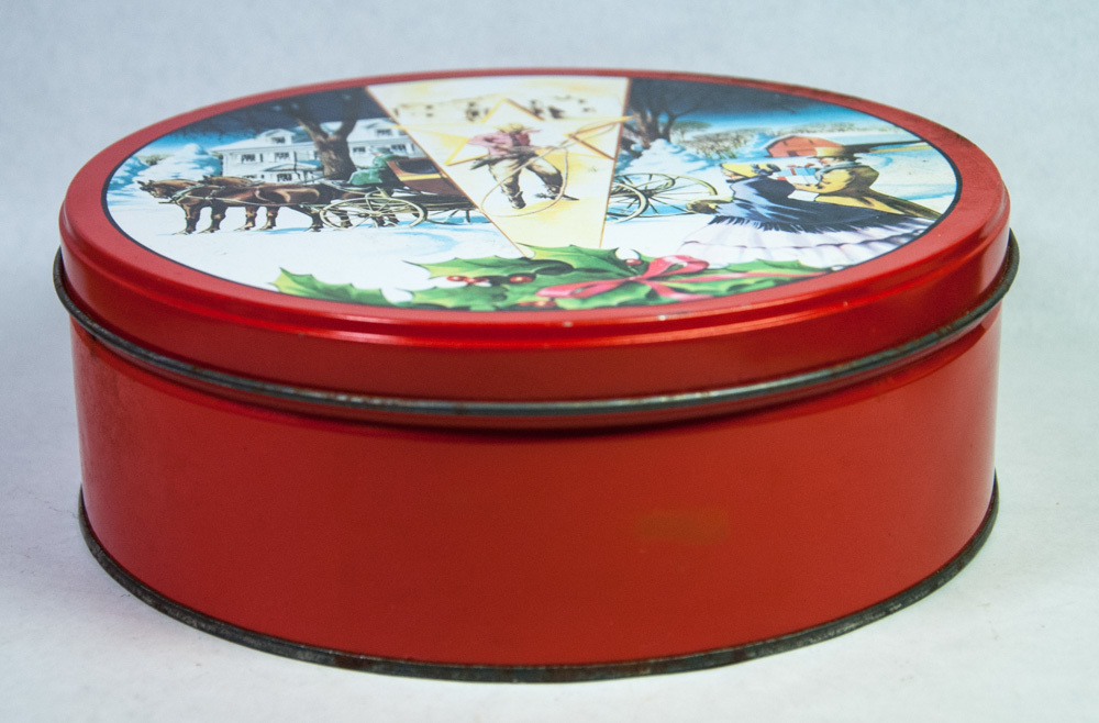 Deluxe 8" Christmas Fruit Cake tin from the Collin Street Bakery in Corsicana, Texas. This is an older vintage "Lone Star" tin that does not have the name of the bakery on the lid. There is a little rust along the lid's rim and a slight indentation near the rim of the tin. Please look at the photos for condition.