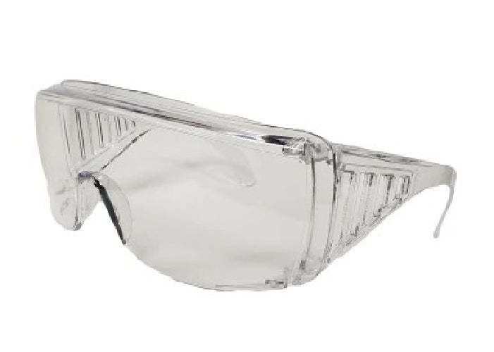 They have a clear plastic frame, a clear polycarbonate lens, and a clear temple. These glasses meet CSA standards.