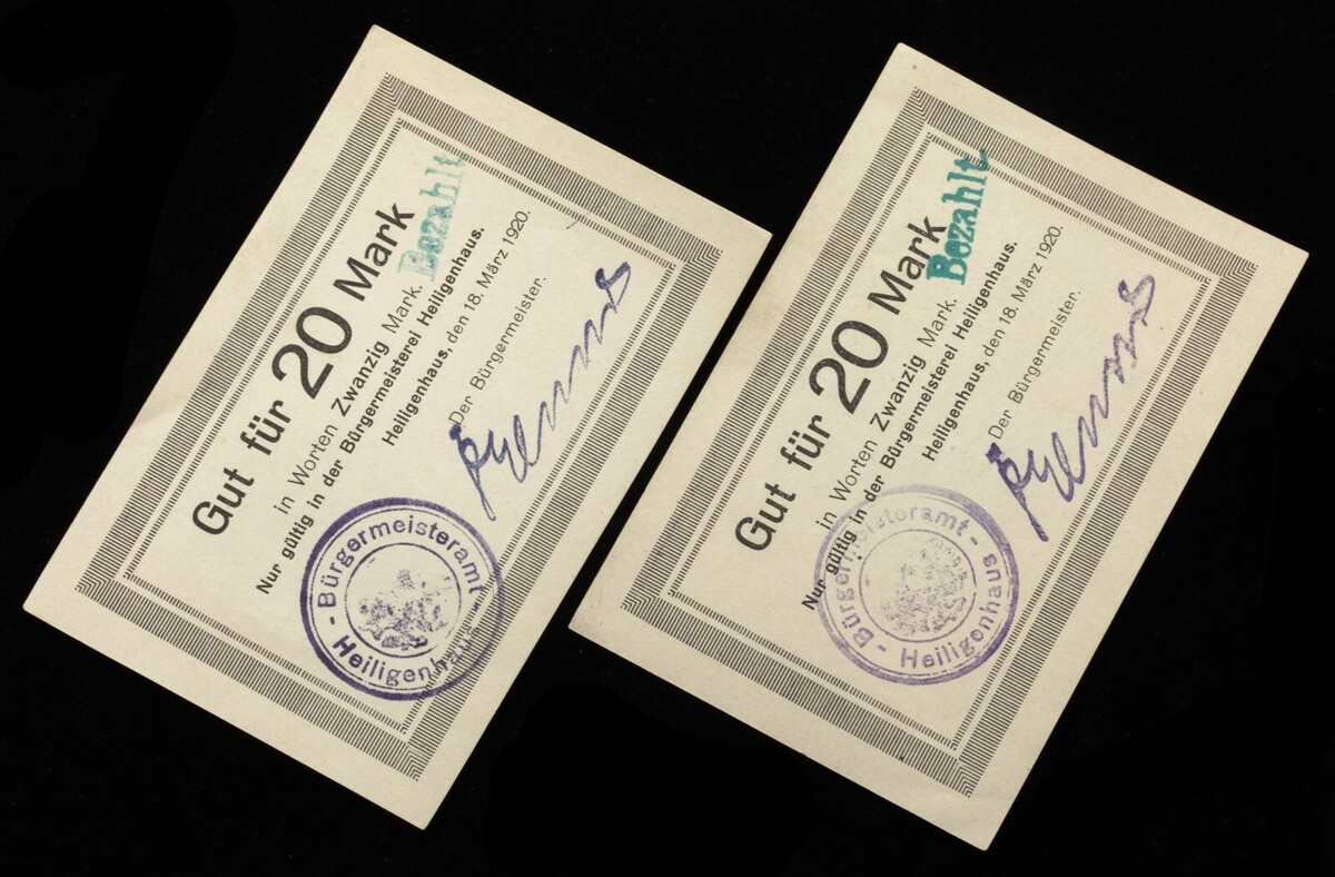 (2) 1918 Heiligenhaus Deutschland 20 Mark, fast unzirkuliert (AU), 111x75