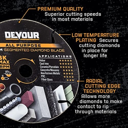 The DEVOUR PREMIUM ALL PURPOSE Blades have up to 100X longer life than standard abrasive wheels for cutting in a wide variety of materials. For use on grinders and saws. Very effective and fast cutting performance on rebar, cast iron, concrete, pavers, tile, granite, laminate, PVC, and more.