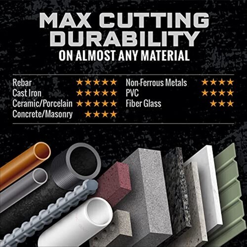 CUTS MATERIAL up to 3x FASTER Very effective and fast cutting performance on all types of material including Rebar, Cast Iron, Concrete, Pavers, Tile, Granite, Laminate, PVC, And More. Cut wet or dry.