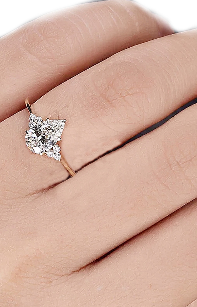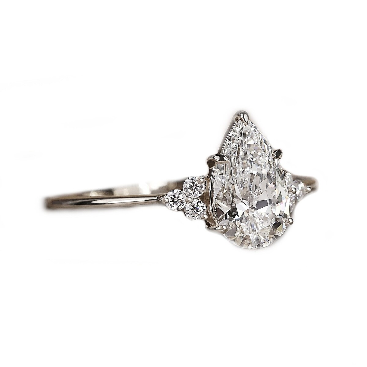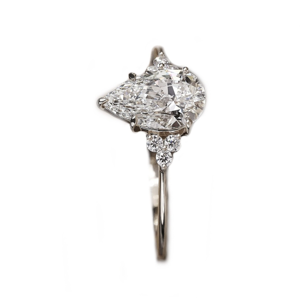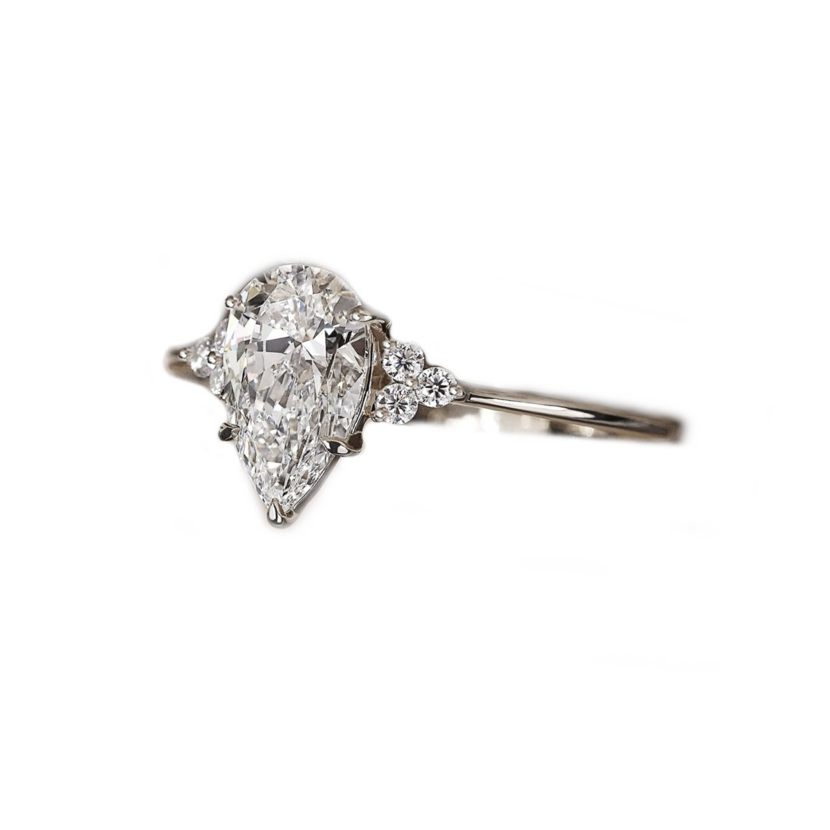 Center Stone: The centerpiece is a pear shape diamond, known for its exceptional sparkle and durability. Diamond is a lab-created that rivals diamonds in brilliance and hardness, making it an excellent choice for an engagement ring.