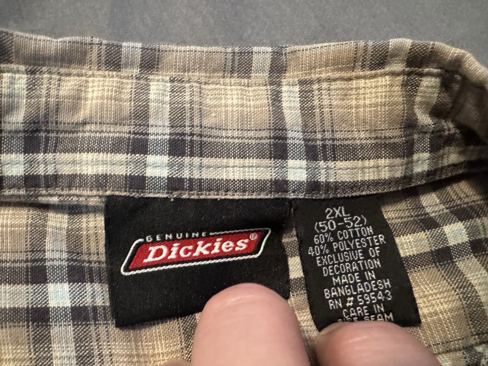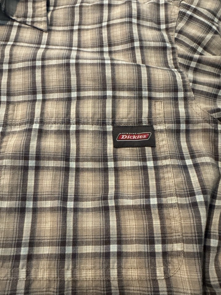 This Genuine Dickies short sleeve button-up shirt blends casual comfort with rugged workwear durability. Crafted from a soft 60% cotton and 40% polyester blend, it features a brown and tan plaid pattern with light blue accents and the iconic Dickies logo on the chest pocket. Tag size 2XL (50?52).