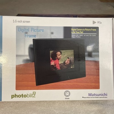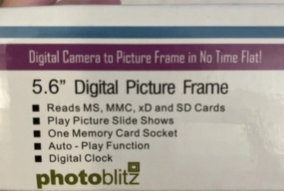 The Photoblitz Digital Photo Frame is a sleek black device with a 5.6-inch screen, perfect for displaying your favorite photos with high resolution and clarity. With easy-to-use navigation and a convenient interface, this digital picture frame allows you to enjoy your memories in style. Its compact size makes it ideal for showcasing your photos in any room of your home.