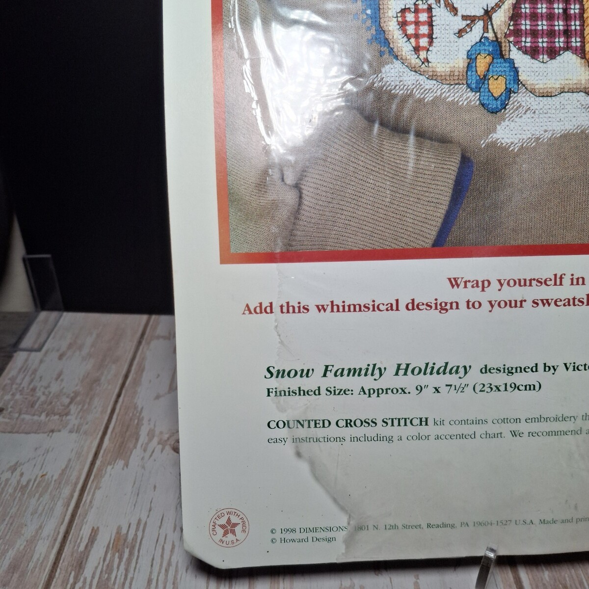 Dimensions Christmas holiday snowman snowmen Cross Stitch Kit #8578 SNOW FAMILY HOLIDAY 1998 package ripped on side and bottom, see photos.