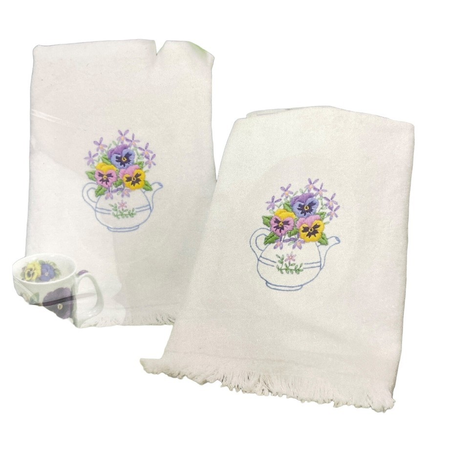 Features 2 terry cloth towels with purple and yellow Pansy flowers in teapots.