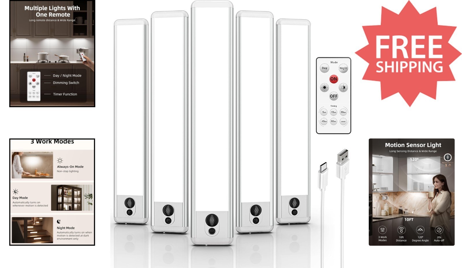 - Dimmable LED Under Cabinet Lights - Wireless USB Charging & Motion Sensor 5-Pack