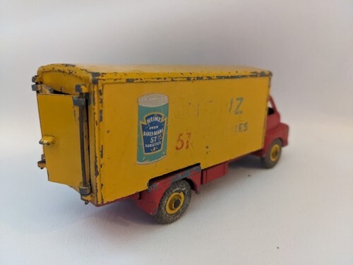 A vendre est un camion Dinky 923 Bedford Van Lorry Truck Heinz 57 varietes de feves au lard d'occasion rouge jaune.