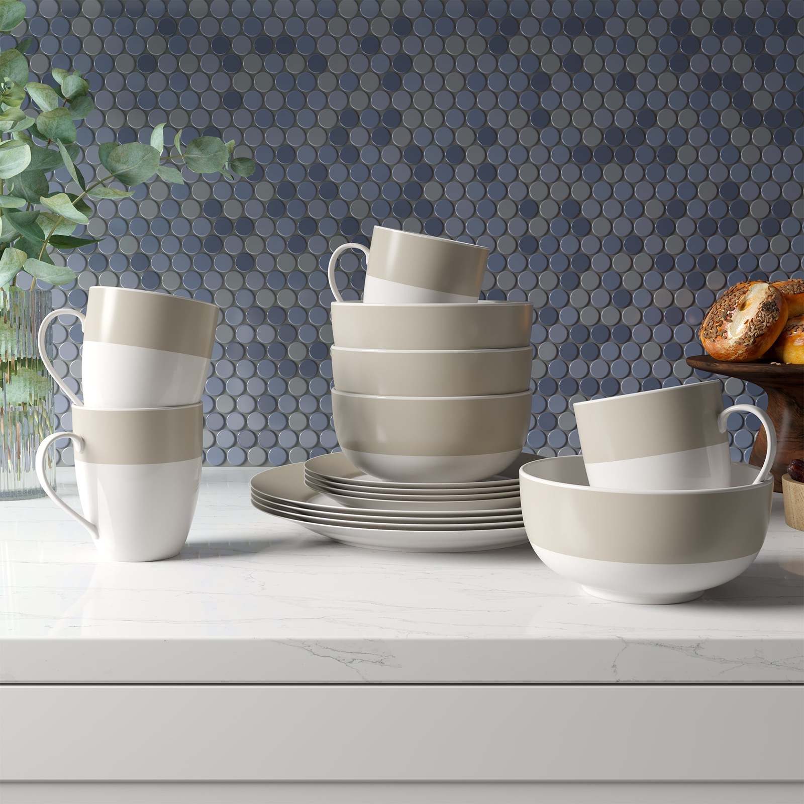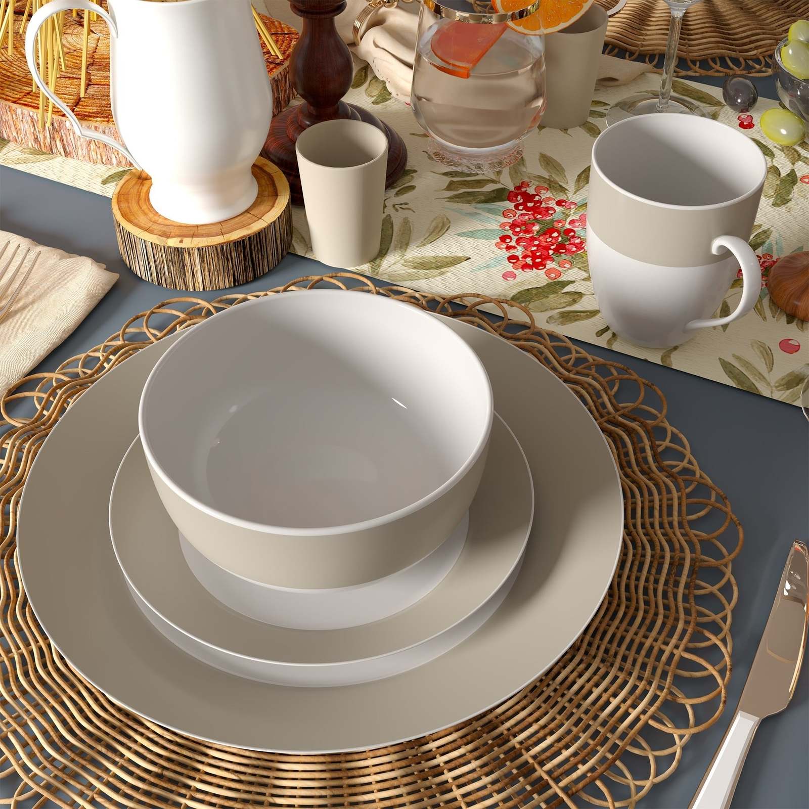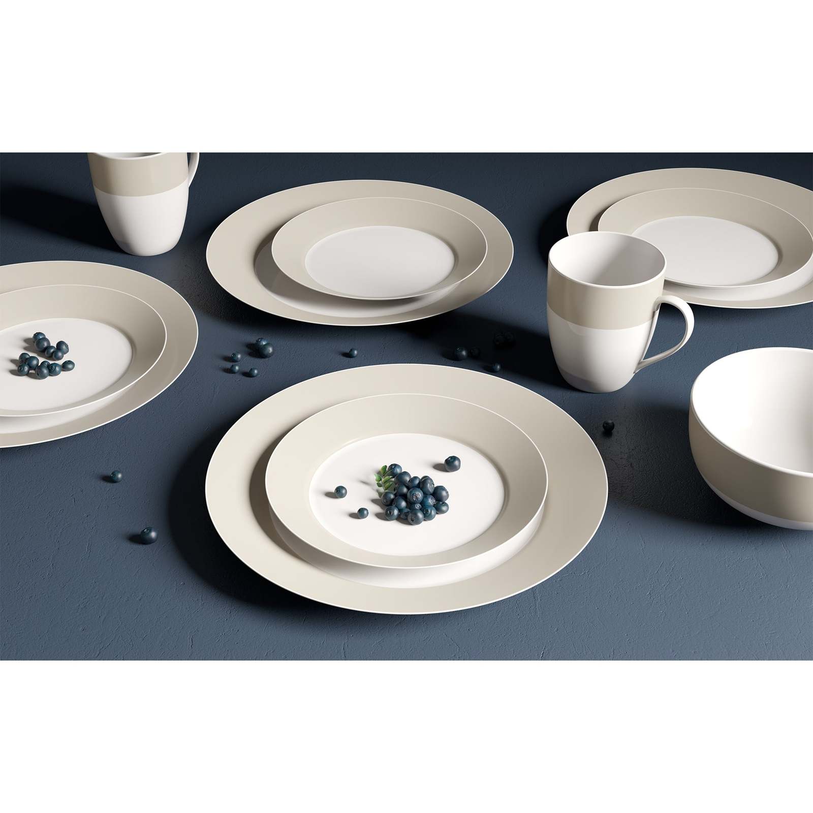 - Dinnerware Set Round Rim 16 Piece Taupe Band Service for 4