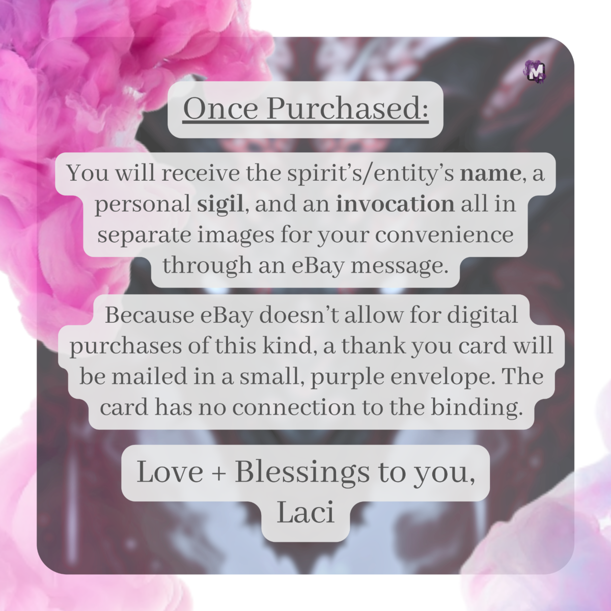 Once purchased, You will receive the spirit?s/entity?s name, a personal sigil, and an invocation all in separate images for your convenience through an message. Please give me some time in case I am asleep or otherwise occupied. I will send everything along as soon as I can.