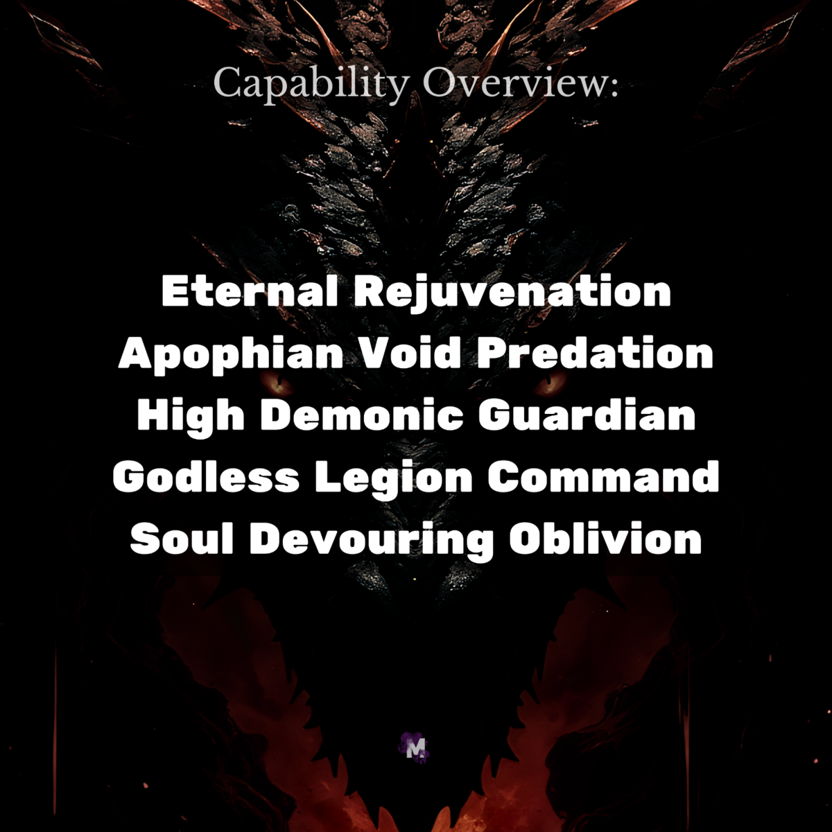 Soul Devouring Oblivion: The Dragon?s signature ability is his power to devour souls and cast them into oblivion. He does not simply kill, he obliterates, reducing all that he touches to nothingness. His Chaos Magick feeds directly from the soul?s energy, erasing its existence from all realms. His power is absolute, and the souls he consumes are lost to time, never to return.