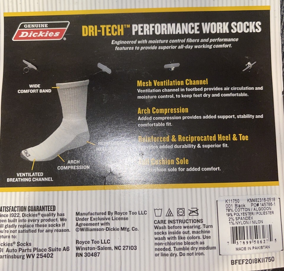 - DISCONTINUED DICKIES BLACK SIZE 6-12 PERFORMANCE WORK CREW DRI-TECH SOCKS 3 PAIR