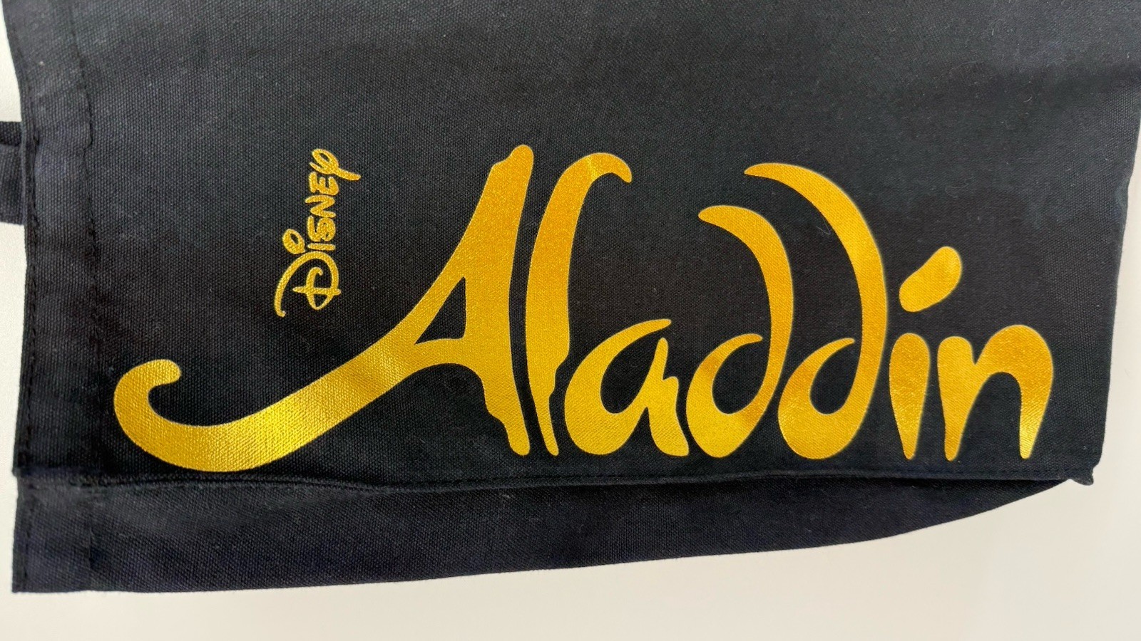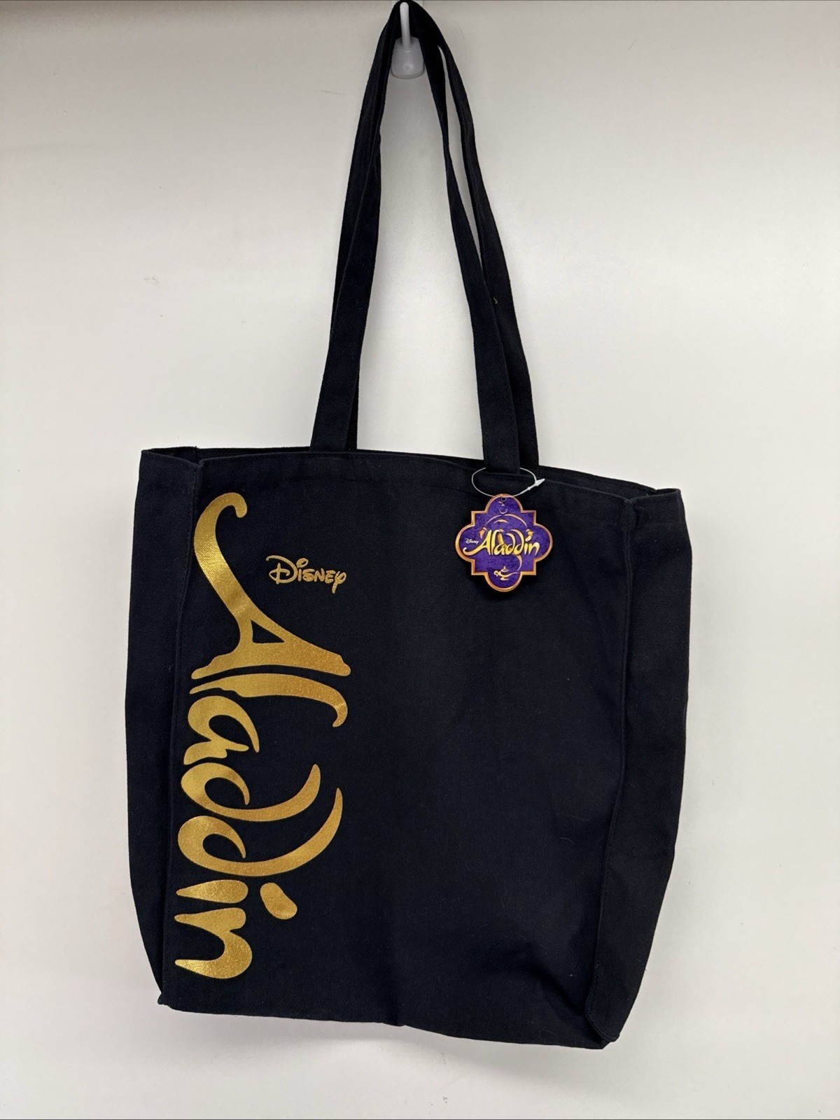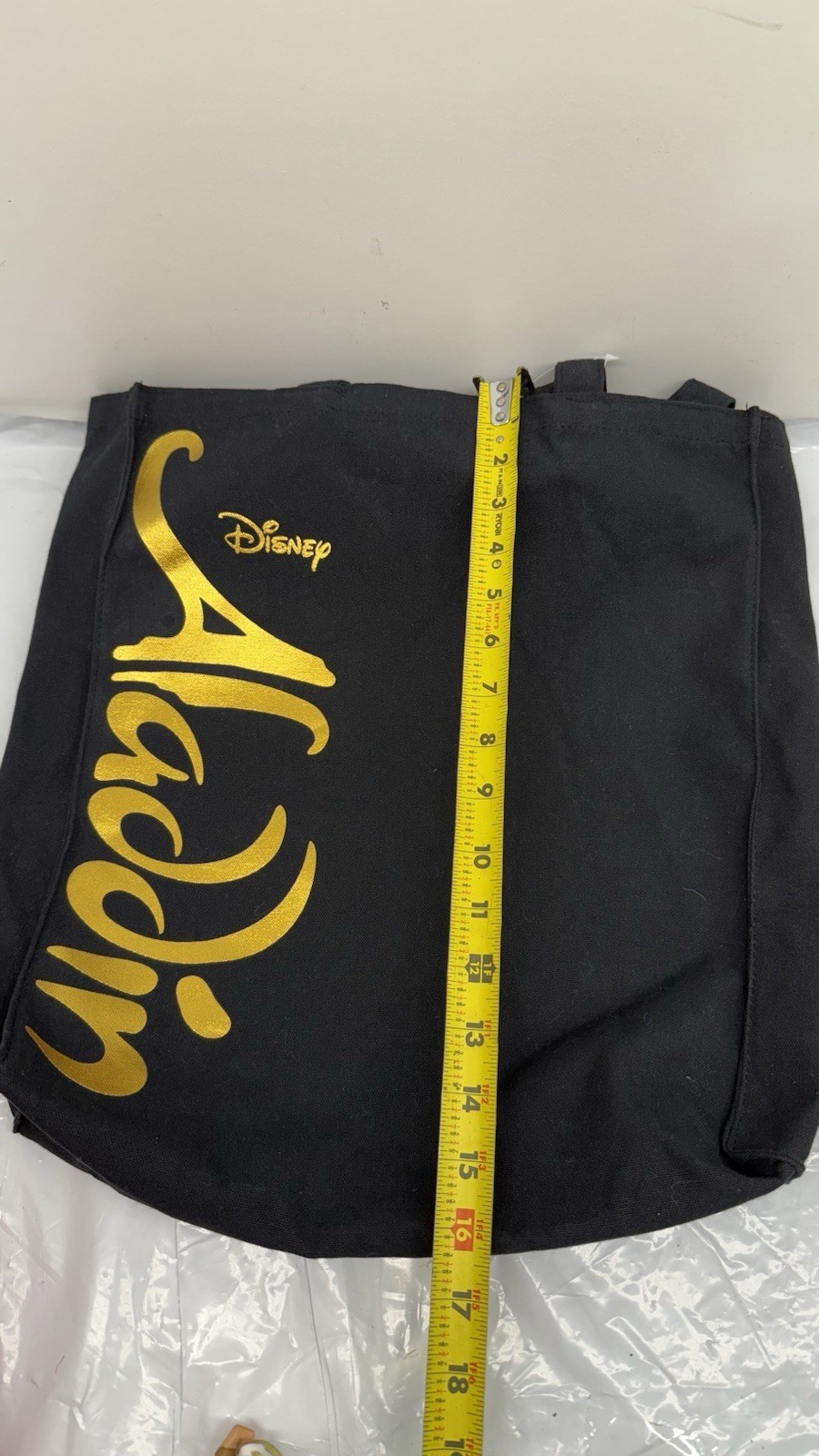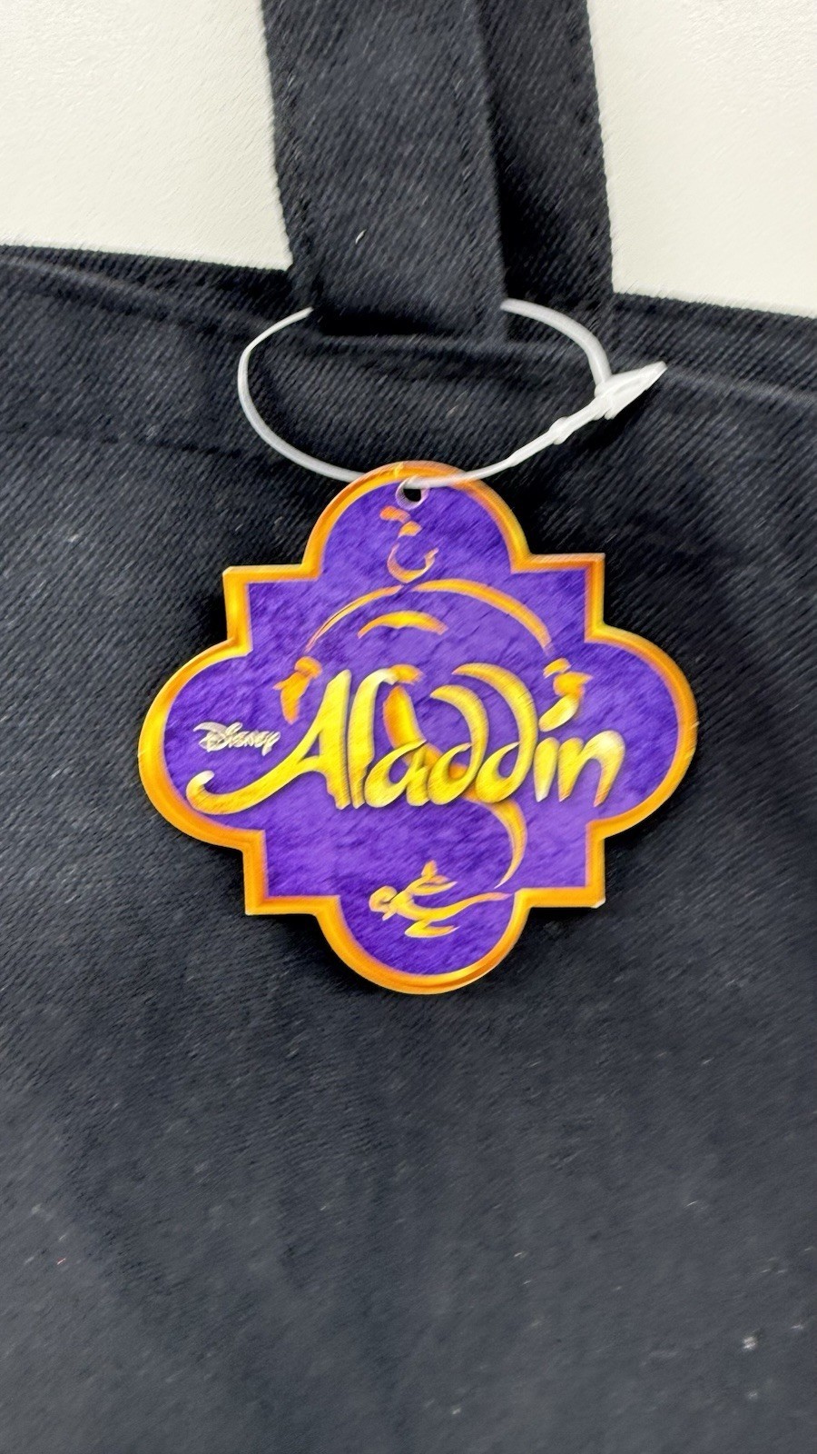 Has a white outline on back side as shown in pics . Not sure what it is. The Disney Aladdin Tote Canvas Bag features iconic characters from the beloved Aladdin franchise, including Genie, Jasmine, and Apu. This medium-sized bag is perfect for fans of Disney looking to show off their love for the classic story. Made by Disney themselves, this bag is a must-have collectible for any Disneyana enthusiast. Perfect for everyday use or showcasing at Disney-themed events, this unique tote is a fun and stylish addition to any collection.