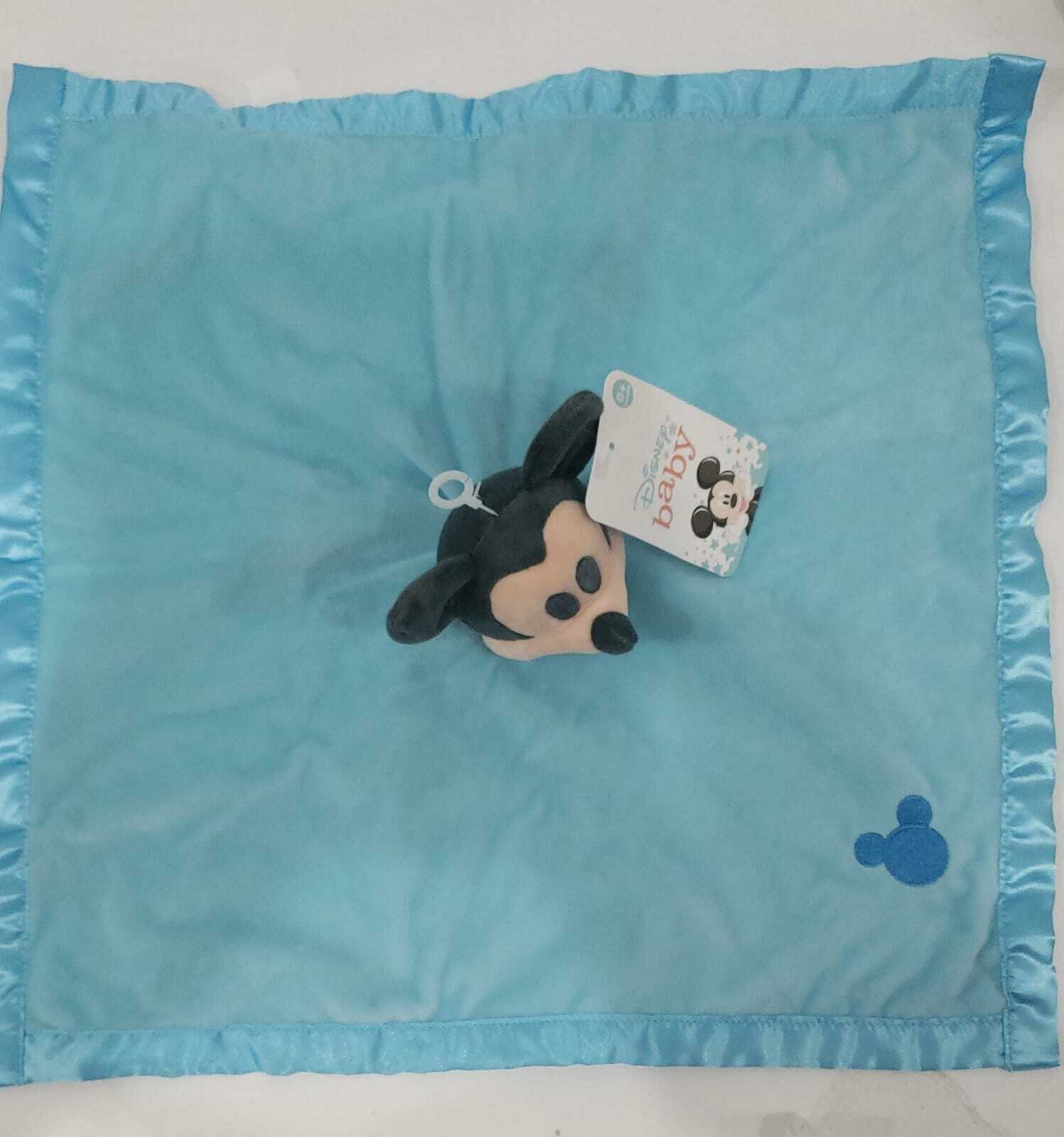 Disney baby infant baby Boy blue satin trimmed security blanket with a plush Mickey Mouse head soft and silky blanket with satin trim around the edges.