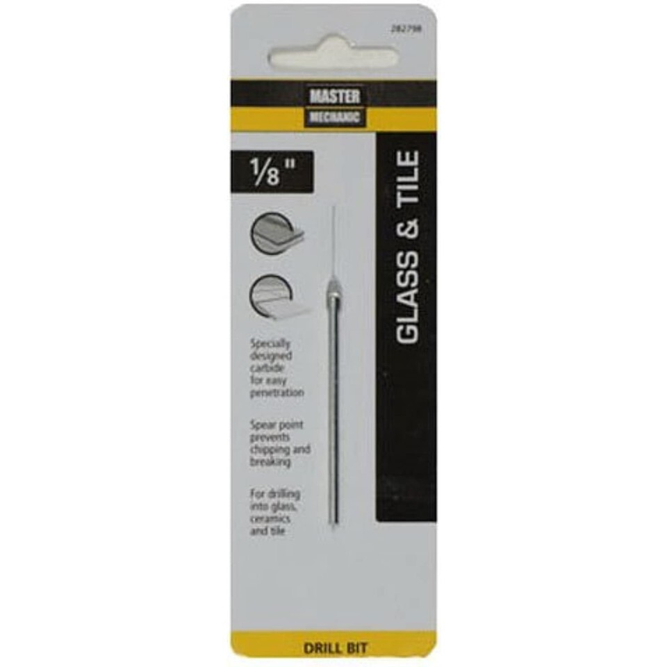 Master Mechanic, 1/8" x 2-1/4", glass tile, carbide tipped drill bit, standard shank, Spear pointed tip reduces breakouts when drilling from 1 side to the other, may be used with any 3/8" drill press or variable speed drill, zinc finish, recommended for use in ceramic tile, mirrors or glass of all types, marble, tile, vitrolite China, Carded.
