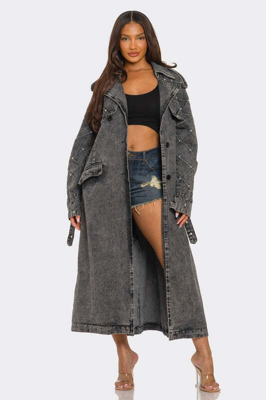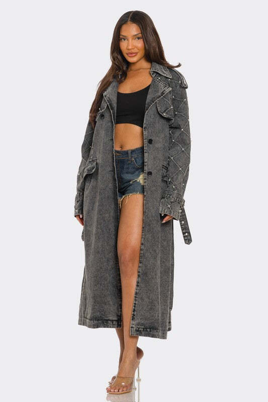 Elevate your wardrobe with our Distressed Denim Trench Coat-a modern twist on a timeless classic. This long, tailored coat combines edgy aesthetics with elegant craftsmanship. Featuring an intricately quilted pattern on the sleeves adorned with delicate studs, it offers just the right amount of attitude and flair.