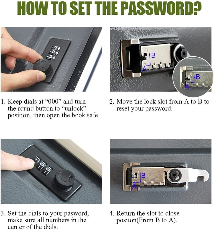 1. Keep dials at "000" and turn the round button to "unlock" position, then open the book safe