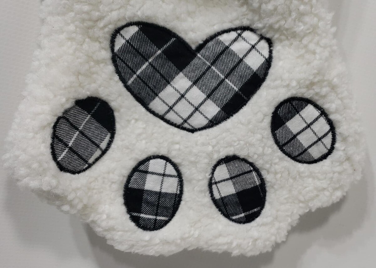 Features a charming black and white buffalo check plaid sherpa design with paw print and heart accents.