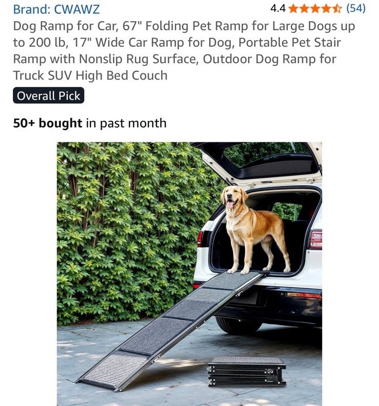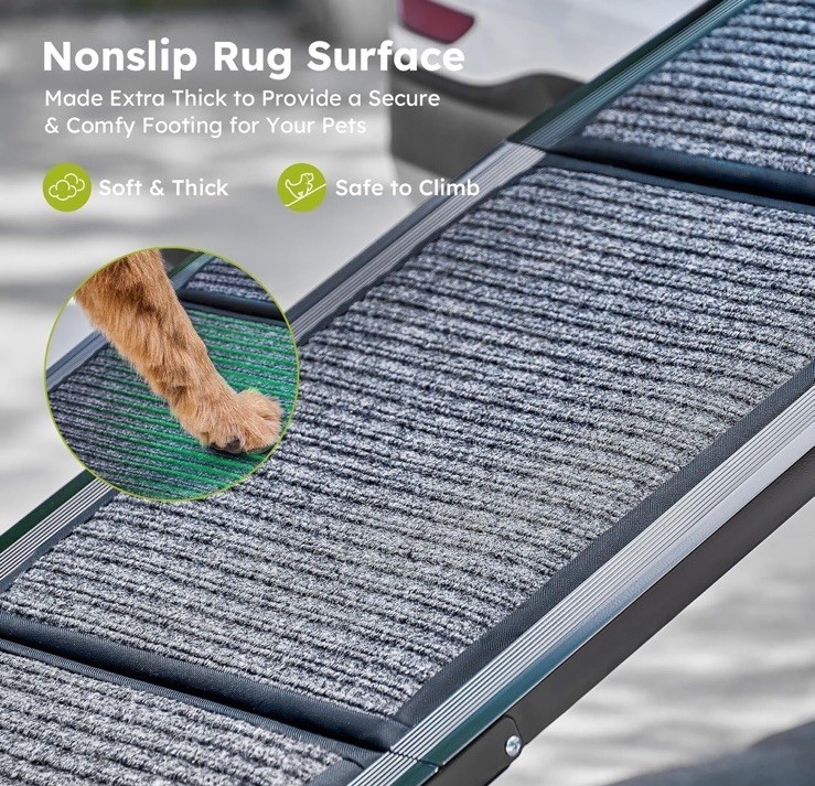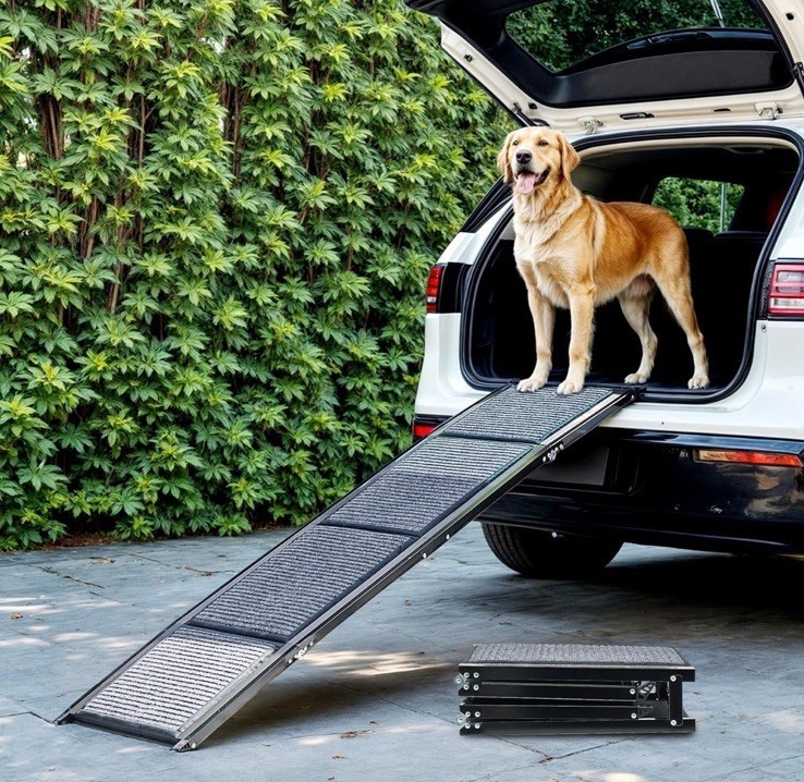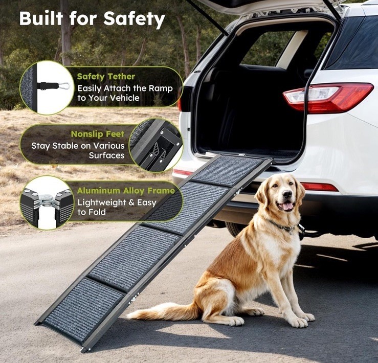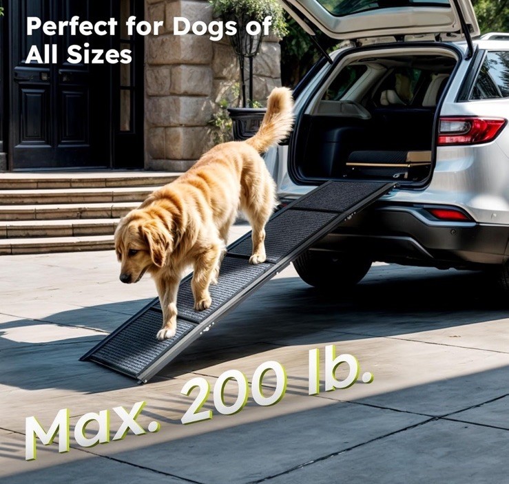 The product is a 67" folding pet ramp designed specifically for large dogs weighing up to 200 lb. This ramp provides easy access for pets to get in and out of the car, making transportation easier and more comfortable for both the pet and pet owner. Its sturdy construction and portable design make it convenient to use at home or on the go. With its generous size and weight capacity, this dog ramp is ideal for helping large dogs safely and comfortably enter and exit vehicles.
