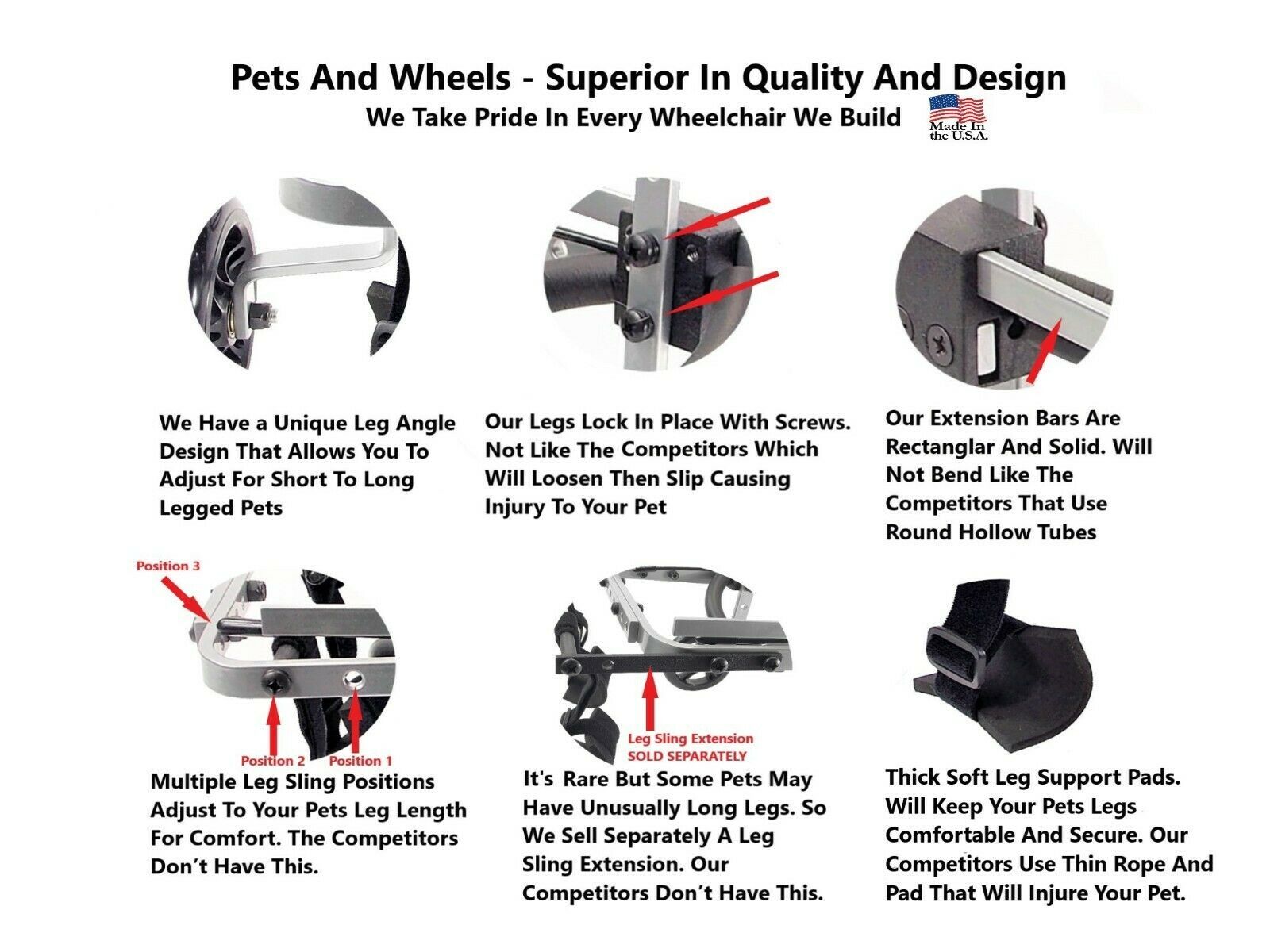 ****MULTI-POSITION LEG SLING SYSTEM - Every Pet Is Different In Leg Length So We Designed Our Wheelchairs With A Multi-Position Leg Sling System. There Are Three Different Positions Allowing You To Set The Best Position For Your Pet. Leg Slings Have Thick Neoprene Pads For Comfort And Greater Support. Our Competitors Use Thin Rope With Thin Pad Which Can Dig Into Your Pets Leg Causing Injury And Discomfort. We Are The Only Builder To Have A Comfortable Multi-Position Leg Sling System Like This.