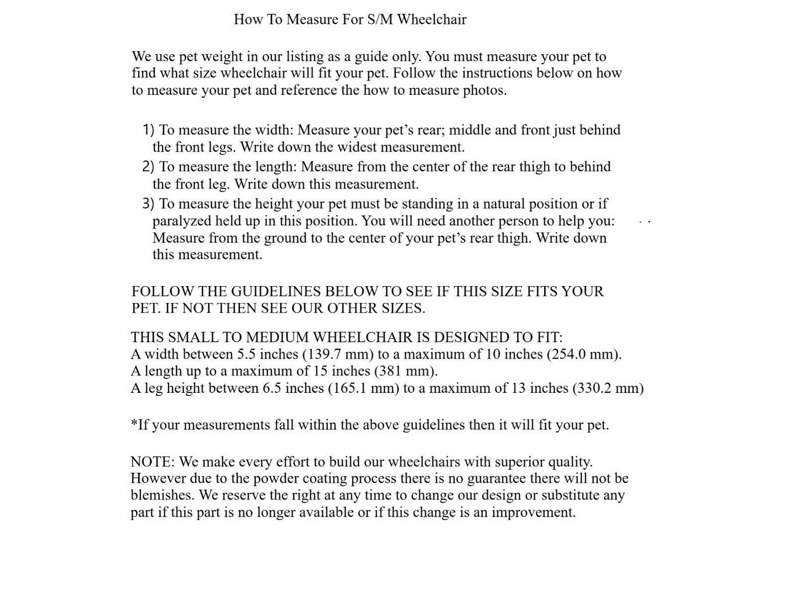 We use pet weight in our listing as a guide only. You must measure your pet to find what size wheelchair will fit your pet. Follow the instructions below on how to measure your pet and reference the how to measure photos.